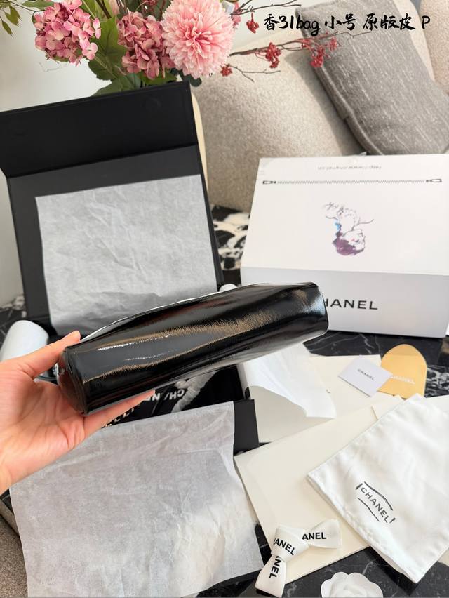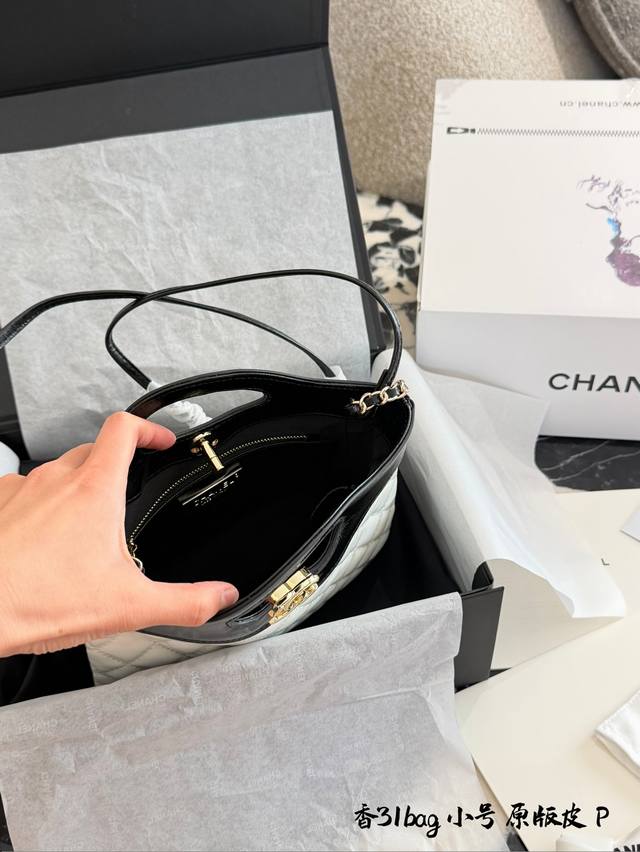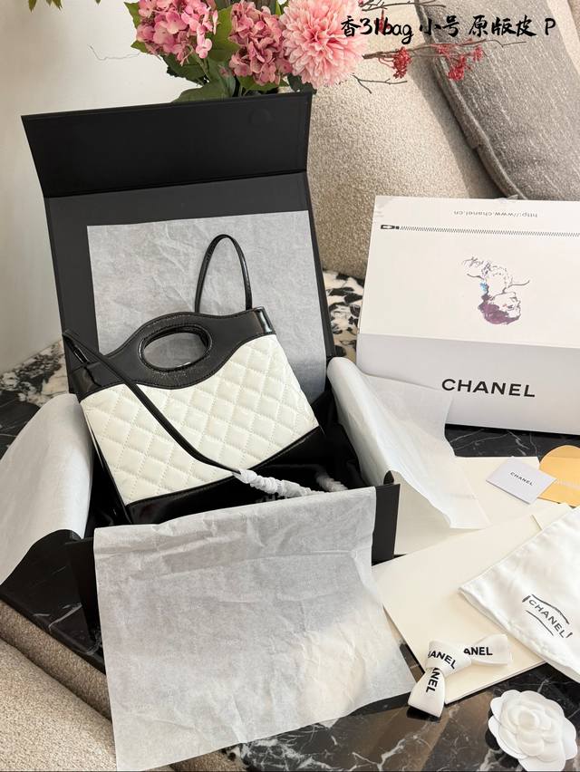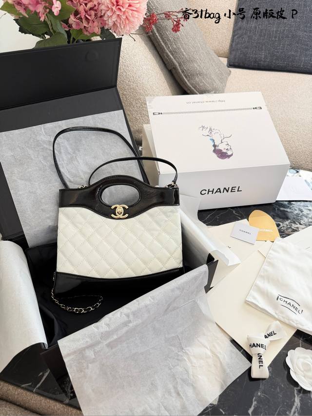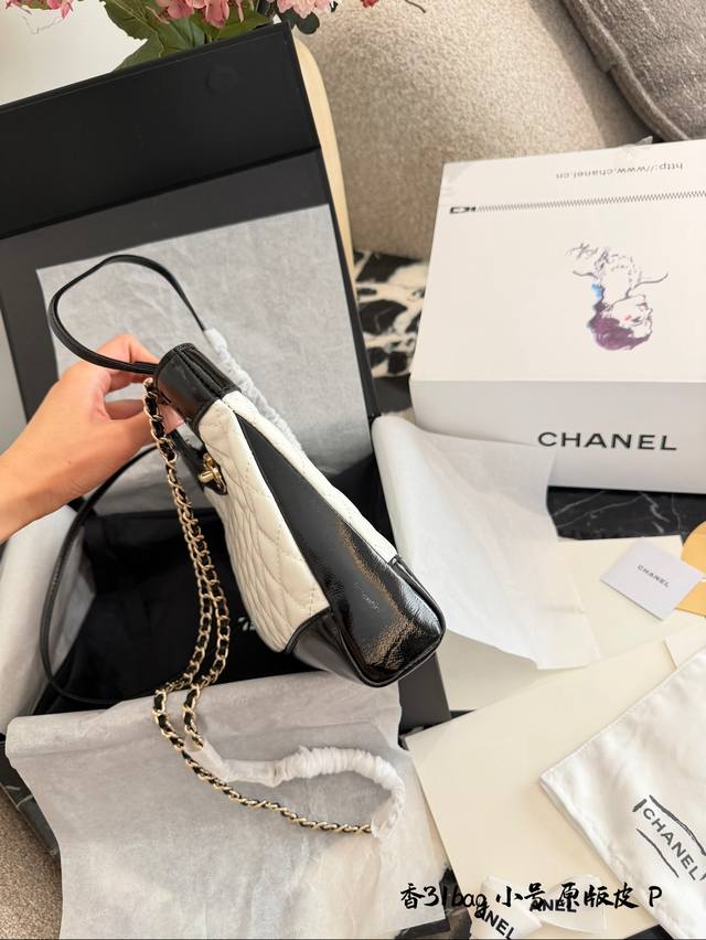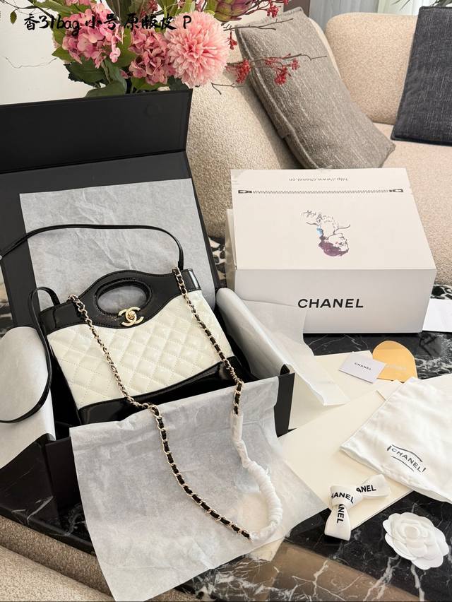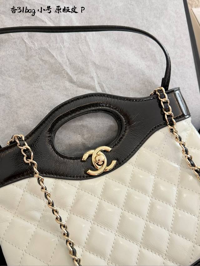 Chanel Mini 31 Bag in Panda Color, Leather. This Chanel Mini 31 Bag features a classic black and white color scheme, patent leather with a quilted design, and light gold hardware for a luxurious feel. Dimensions: 22 x 23 x 5.5 cm. It's compact and elegant, perfect for hand-carrying or crossbody wear. The chain shoulder strap allows for multiple carrying options.