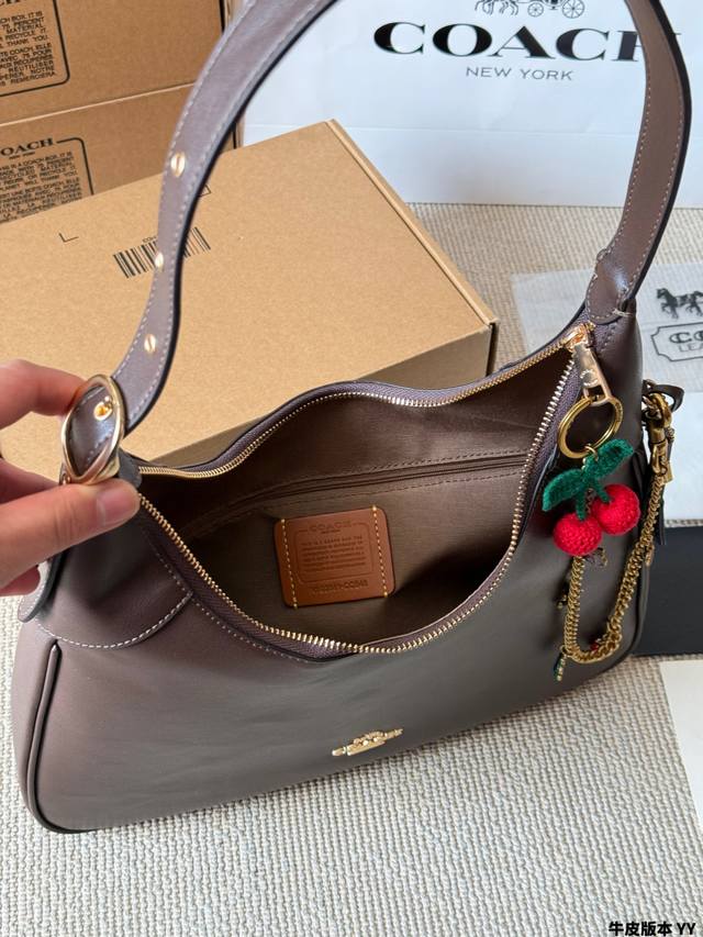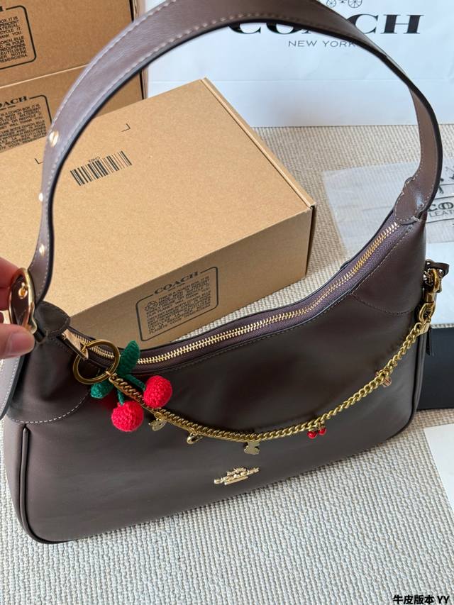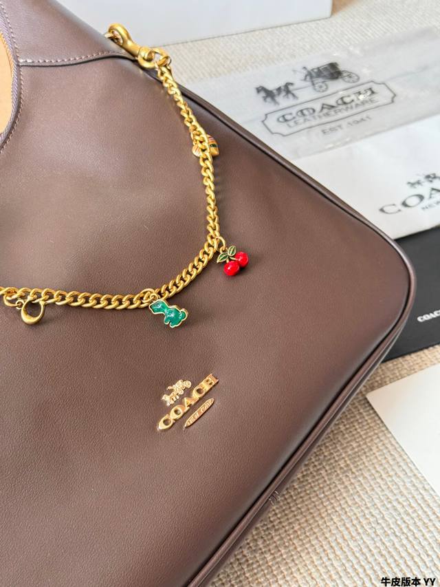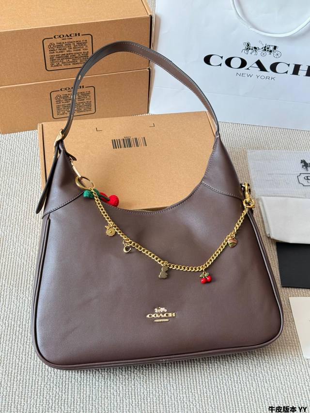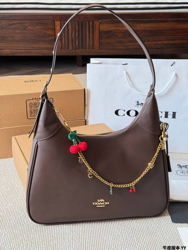 Cowhide Version Coach Ella Shoulder Bag. This Coach Ella shoulder bag is made of soft cowhide, offering a delicate texture and durability. The hobo style features a metal chain and cherry charm, giving it a retro yet fashionable look. The adjustable shoulder strap allows for underarm or crossbody wear. With a moderate capacity, it's practical for both commuting and everyday use! The dark brown color is incredibly versatile; pair it with a leather jacket or coat in autumn and winter for an effortlessly chic and relaxed look. Size: 35 x 25 cm.