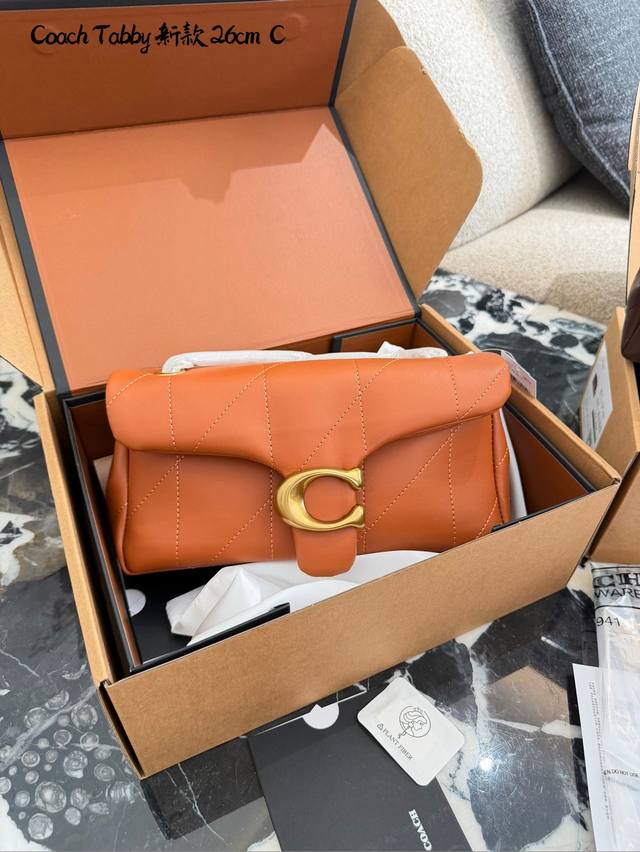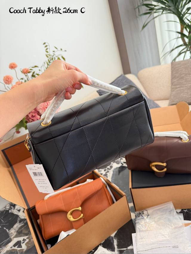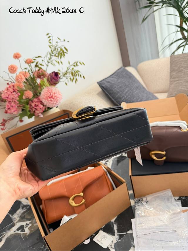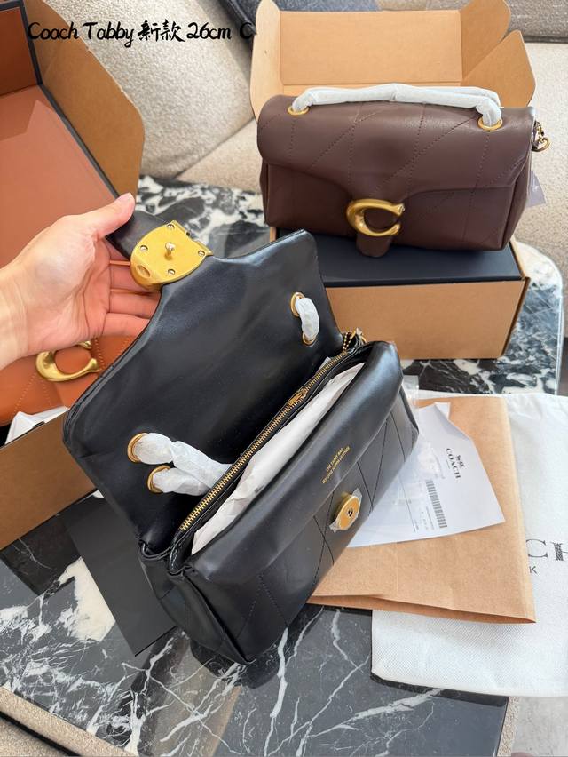 Coach Tabby 26 Black and Gold Lambskin Chain Bag DDD C The Coach Tabby 26 black and gold chain bag is made of soft lambskin, featuring classic quilted diamond stitching and a metal C-shaped buckle. It exudes understated luxury and has a moderate capacity, making it suitable for both commuting and casual wear. The adjustable chain shoulder strap allows for easy switching between shoulder and crossbody wear, making it versatile and flattering for all body types. The black and gold color scheme is timeless and easily complements autumn and winter coats and down jackets, exuding elegance and confidence. Comes with box DDD