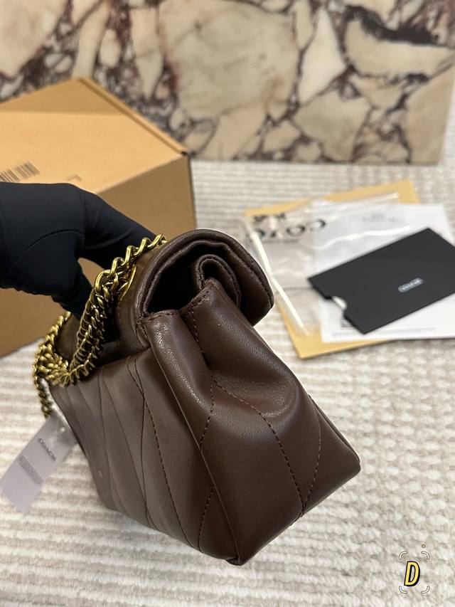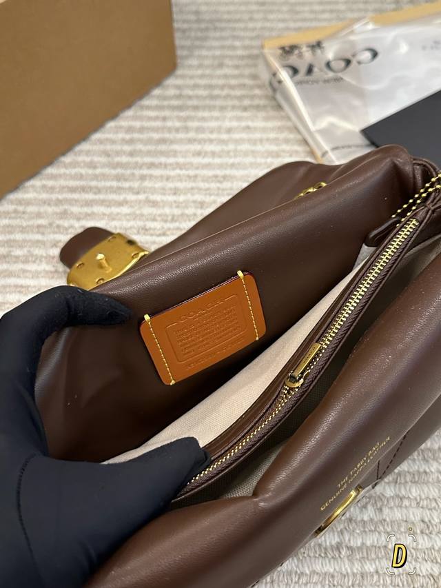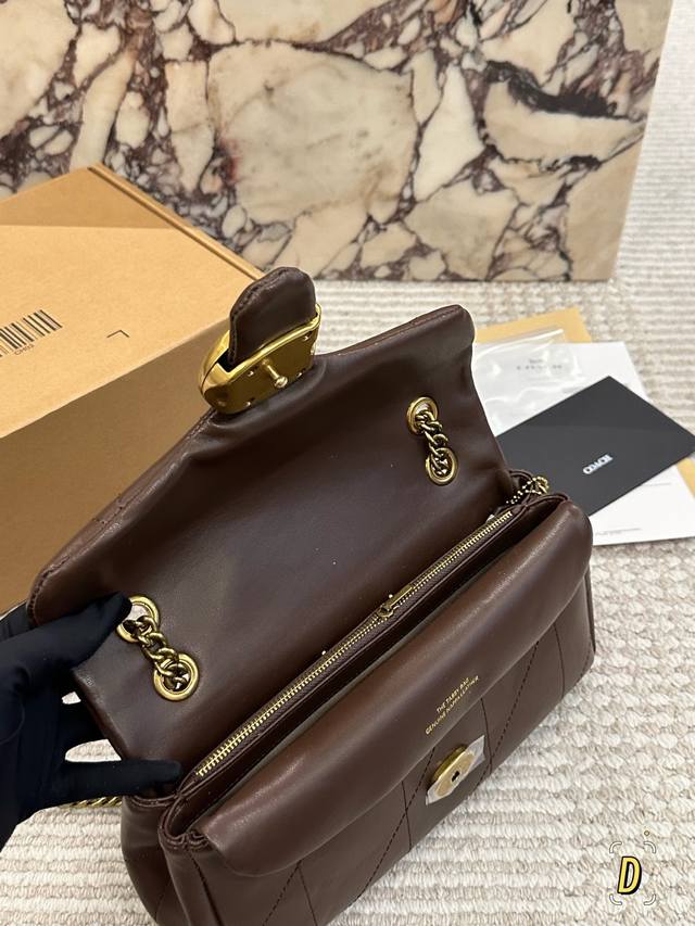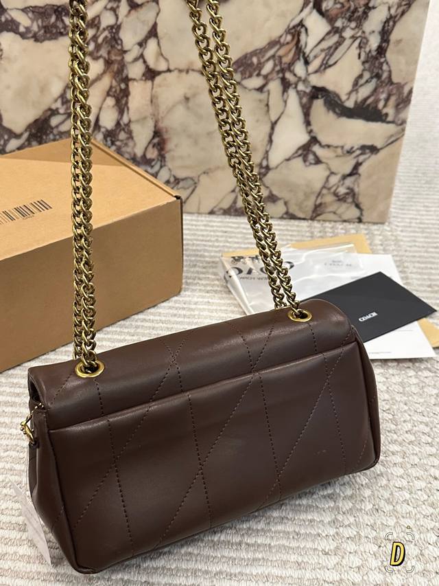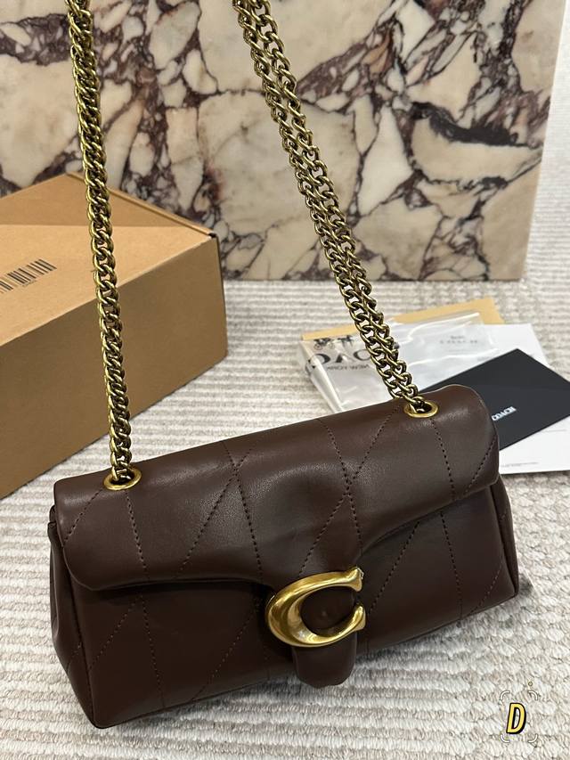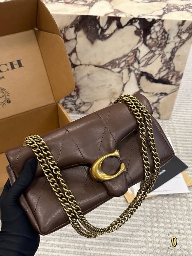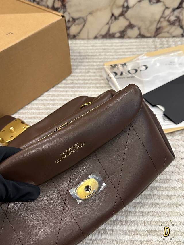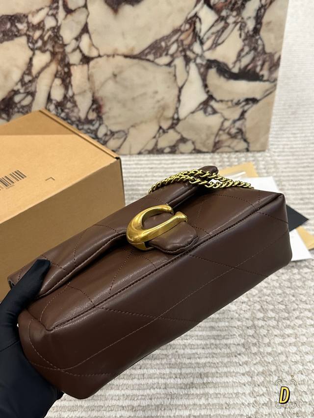 Coach Tabby 26 Black and Gold Lambskin Chain Bag DDD C The Coach Tabby 26 black and gold chain bag is made of soft lambskin, featuring classic quilted diamond stitching and a metal C-shaped buckle. It exudes understated luxury and has a moderate capacity, making it suitable for both commuting and casual wear. The adjustable chain shoulder strap allows for easy switching between shoulder and crossbody wear, making it versatile and flattering for all body types. The black and gold color scheme is timeless and easily complements autumn and winter coats and down jackets, exuding elegance and confidence. Comes with box DDD