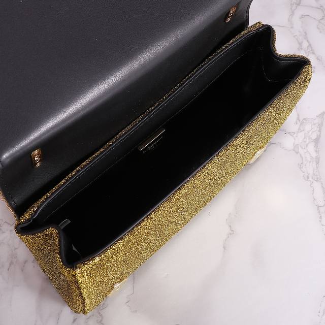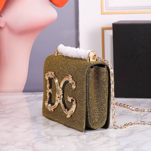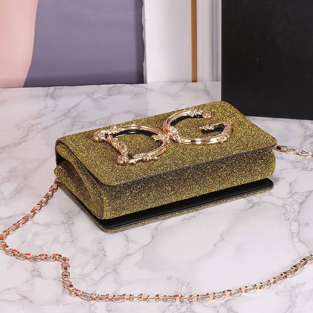 Restocked Dolce & Gabban Dg Girls Series Chain Crossbody Bag. From the Dg Girls series, this baroque Nappa leather crossbody bag features a metallic Abs material and a striking Dg logo. Suitable for any occasion, it's made of calfskin with a front flap, hidden magnetic snap closure, perforated chain, vintage gold-plated Nappa leather lining, and an internal logo tag. Model: 11018, Size 21*5*13.5 DDD