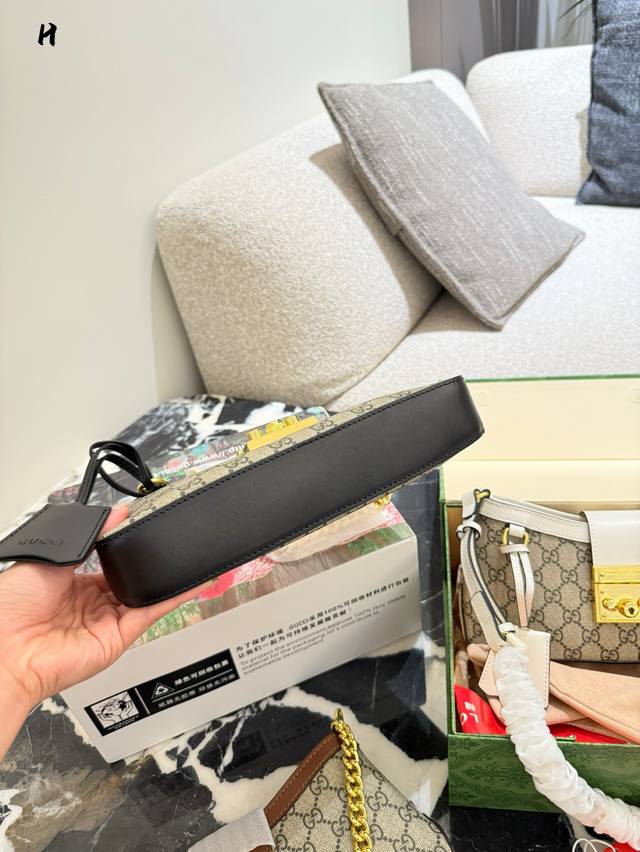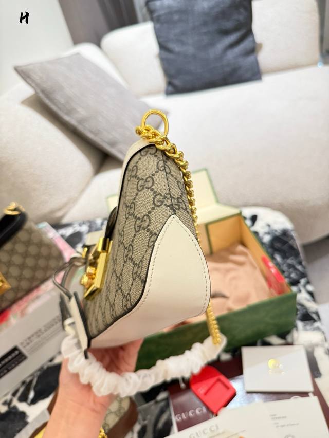 G House This small shoulder bag is inspired by the brand's origins in the handmade trunk studio. It is made of black and ebony Gg Supreme canvas and has a striking padlock closure with cowhide piping and a new adjustable leather chain shoulder strap. Gold-tone hardware and leather keychain add to the charm of the whole design.