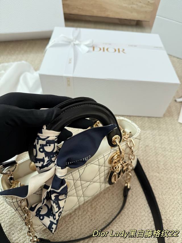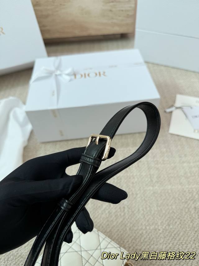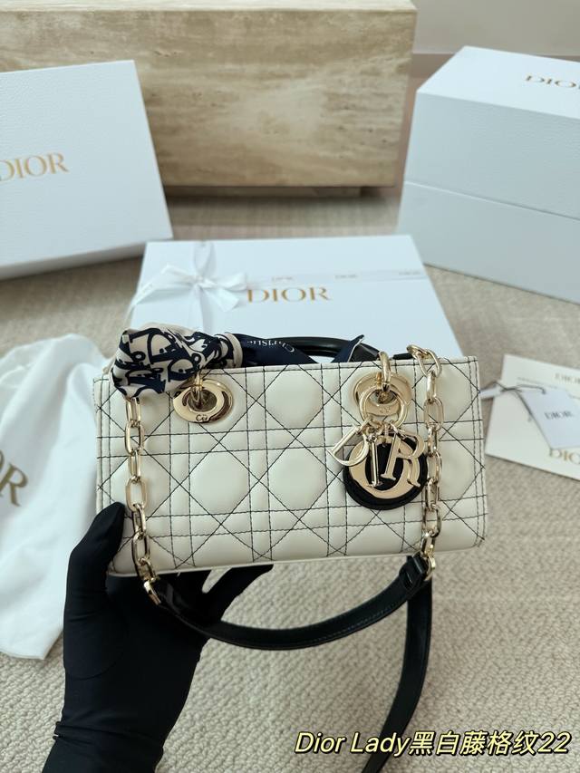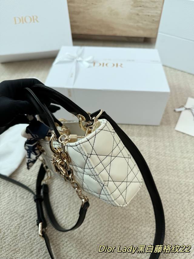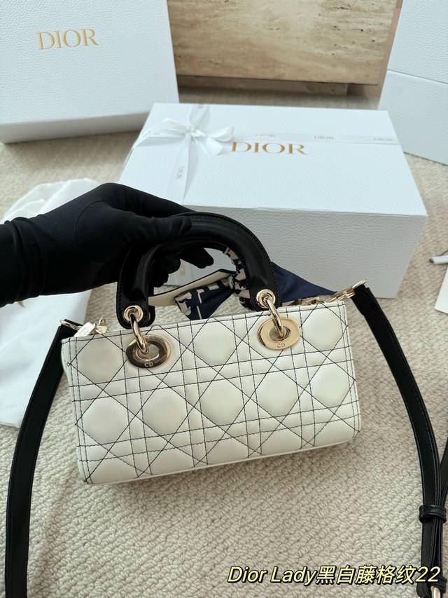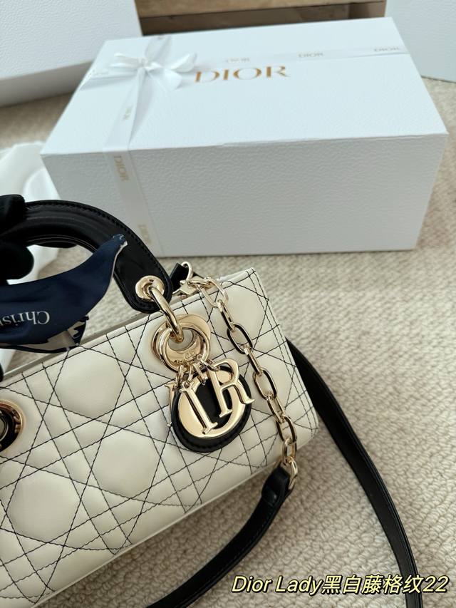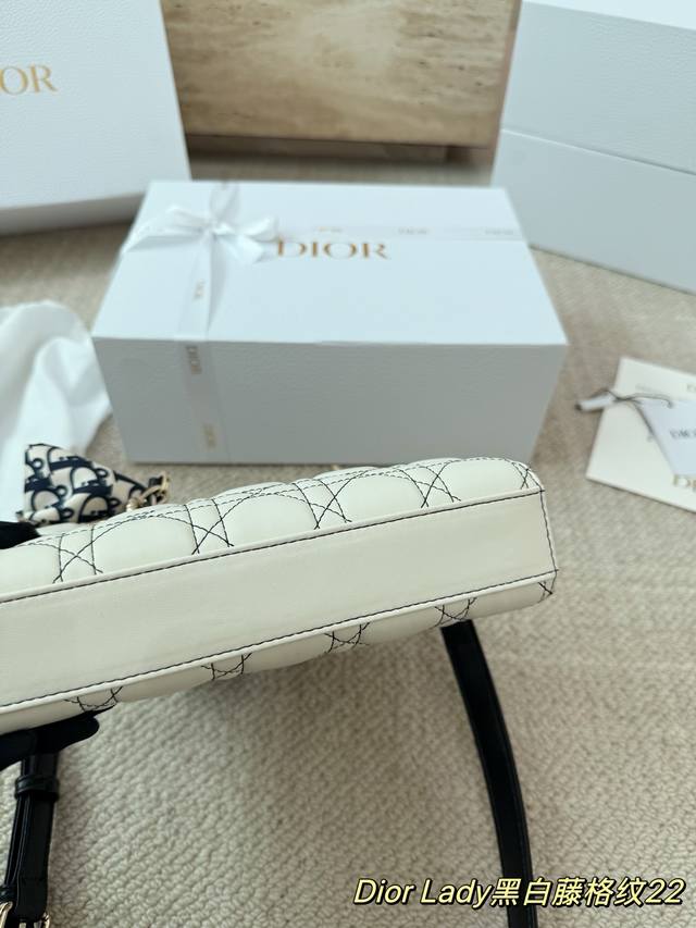 26 Early Spring New Arrival: Dior Lady D-Joy Horizontal Leather Bag. This Dior Lady D-Joy horizontal bag is crafted from cream-colored lambskin, paired with black handles and light gold-tone metal, exuding elegance and sophistication. The cannage stitching and D.1.OR charm add to its exquisite details! Measuring 22