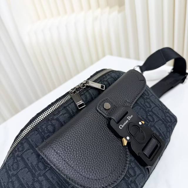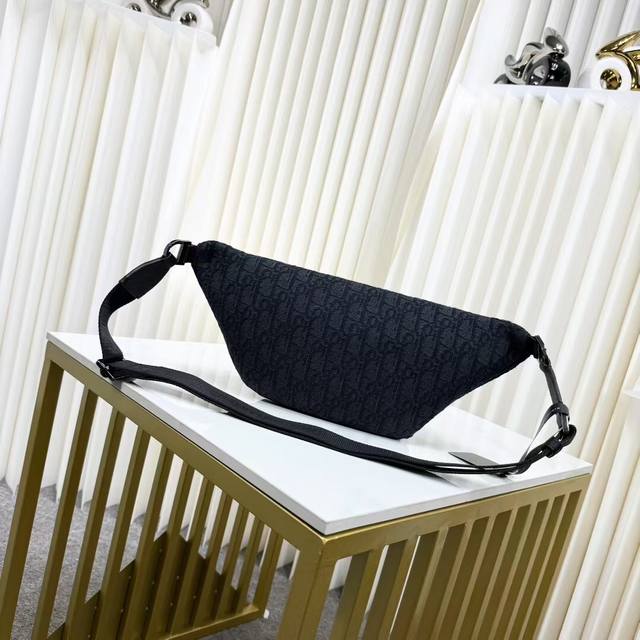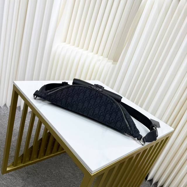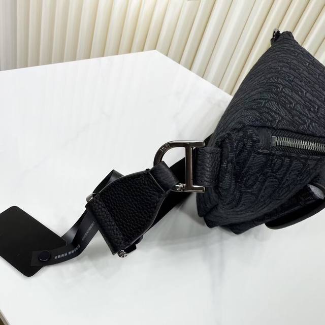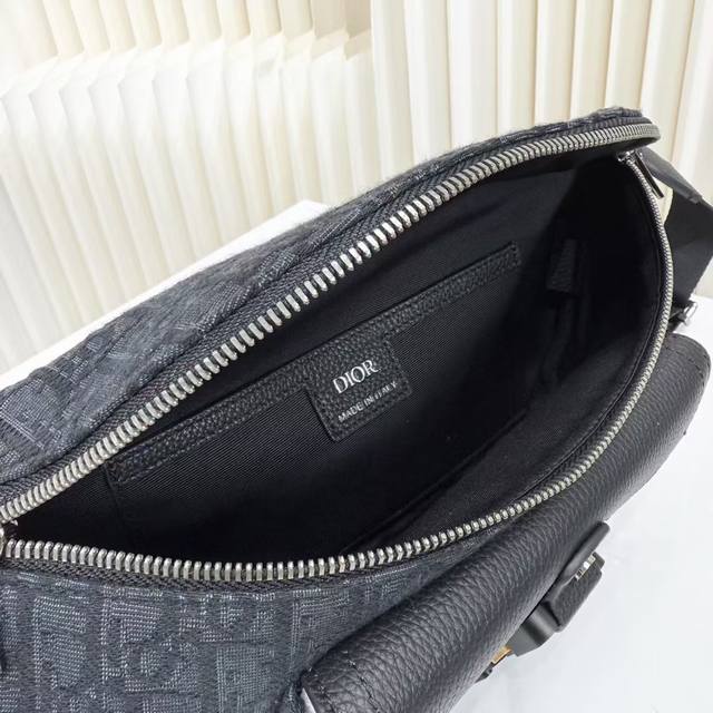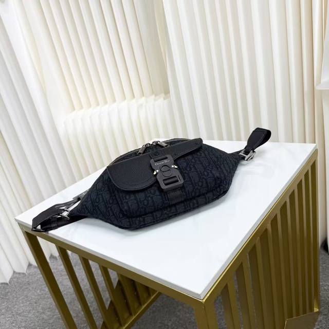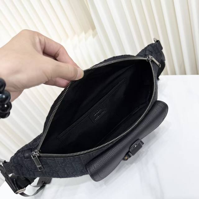This belt bag combines saddle bag style with stylish and practical design. Expertly crafted from black Oblique print fabric and other materials, it's enhanced with tonal grained cowhide leather details. The zippered compartment complements the front saddle flap pocket with an aluminum buckle for easy storage of everyday essentials. The adjustable shoulder strap allows it to be worn as a waist bag or crossbody.