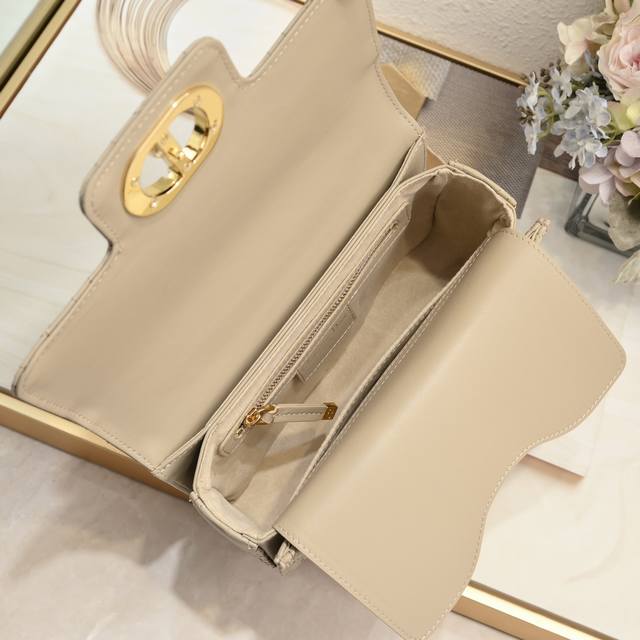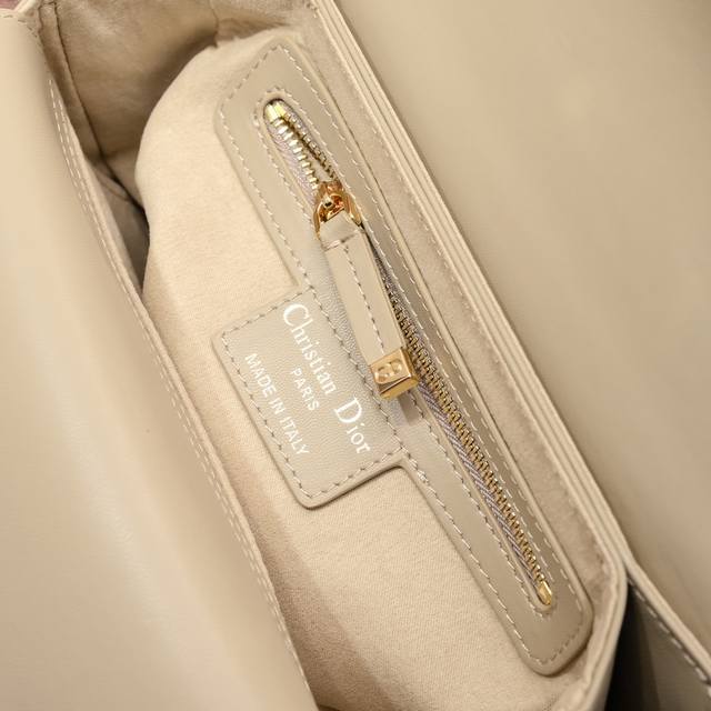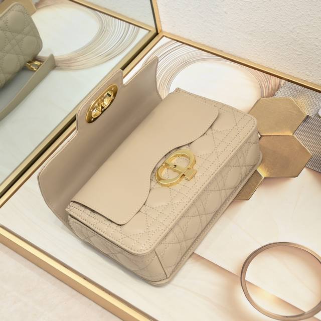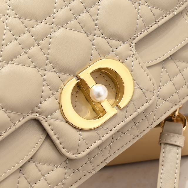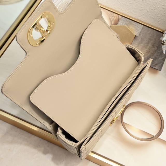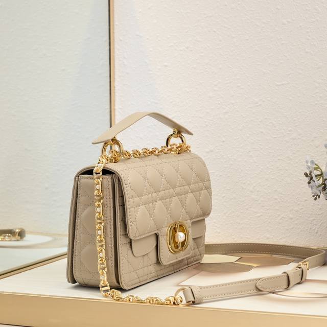 This Dior Jolie handbag is a new product from the 2024 Spring/Summer ready-to-wear collection, combining elegance and practicality. Crafted from white cowhide leather, it is decorated with rattan check stitching. The double flap is decorated with the Cd logo to enhance the style and is embellished with white resin beads. The three compartments and zipper pockets can store various daily necessities and can be matched with daily or evening looks. The small style is equipped with a detachable handle and a detachable chain shoulder strap. The shoulder strap consists of a leather strap and a Cd logo chain link, decorated with white resin beads, which can be comfortably carried. [6]