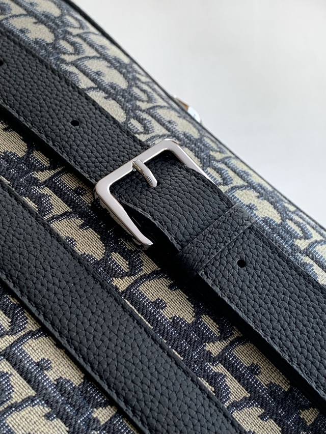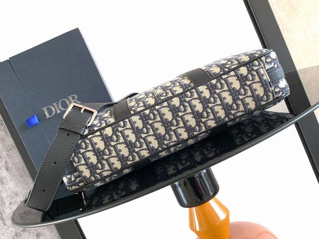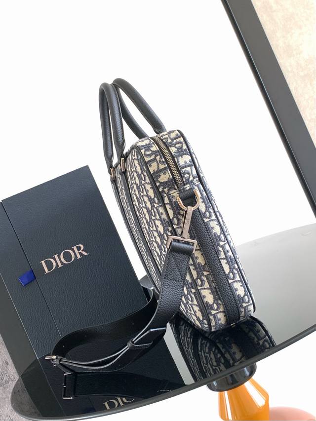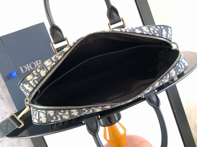 Original Background. This briefcase blends classic elegance with Dior's haute couture spirit. The rigid silhouette is crafted from apricot Oblique printed fabric, with tonal grained calfskin details and a Dior logo on the front enhancing its style. It features a zip closure, a spacious interior compartment for a laptop, and a foldable handle and adjustable, detachable shoulder strap for hand-carrying, shoulder-carrying, or crossbody wear. Body: Cotton, calfskin, and technical fabric. Lining: Technical fabric, cotton, calfskin. Zip main compartment. Flat interior laptop compartment. Two interior slip pockets. Leather top handle. Adjustable, detachable leather shoulder strap with lobster clasp. Front adorned with a metal-coated brass Dior logo. Interior adorned with an embossed Dior logo. Dimensions: 37 x 28 x 6 cm. Item Number: 1Esbr180Yky_H03E