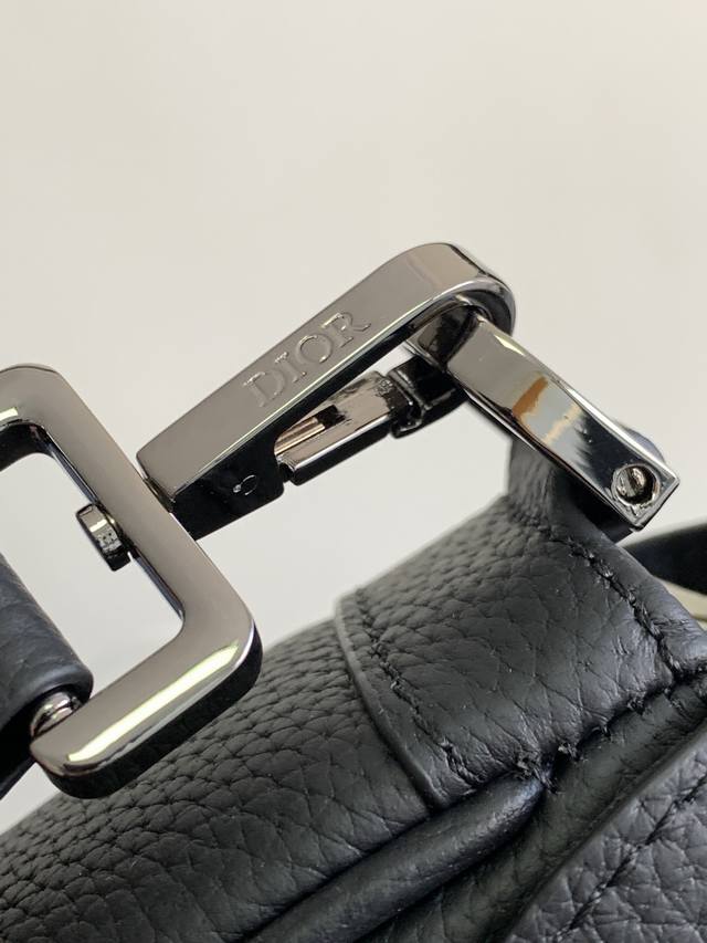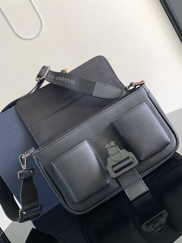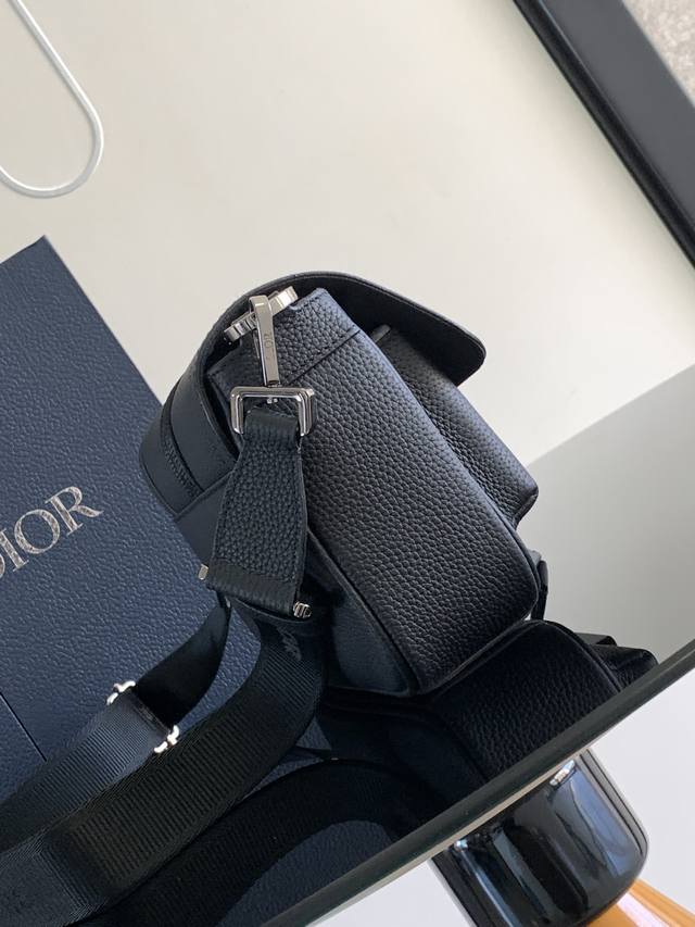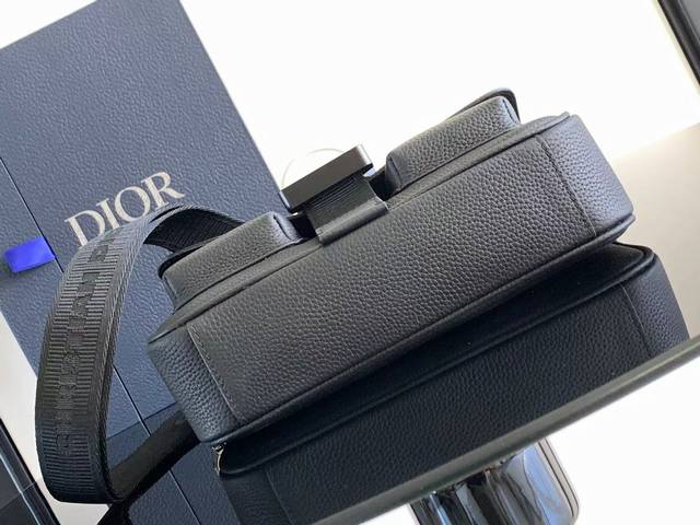 Original Background. This Dior Hit The Road handbag, with its shoulder strap, blends modern style with Dior's haute couture spirit. Crafted from black grained calfskin, it features a flap adorned with a Christian Dior clasp, a spacious main compartment, and two front pockets for easy storage of everyday essentials. Practical and versatile, the adjustable and detachable shoulder strap adds a touch of elegance to any casual outfit. Features include: Black grained calfskin leather; Dior embossed logo on the interior; flap closure with a clasp adorned with the Christian Dior logo and the initials "Cd"; Two front pockets; Adjustable and detachable Christian Dior nylon jacquard shoulder strap; Includes a dust bag; Made in Italy; Dimensions: 27 x 17 x 9 cm; Item Number: 1Htme165Ymj_H00N