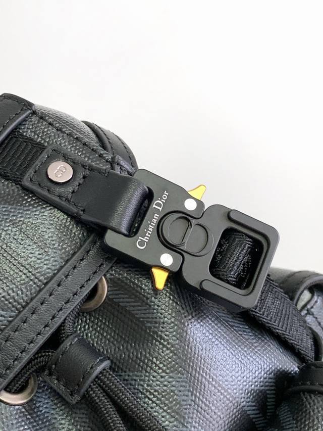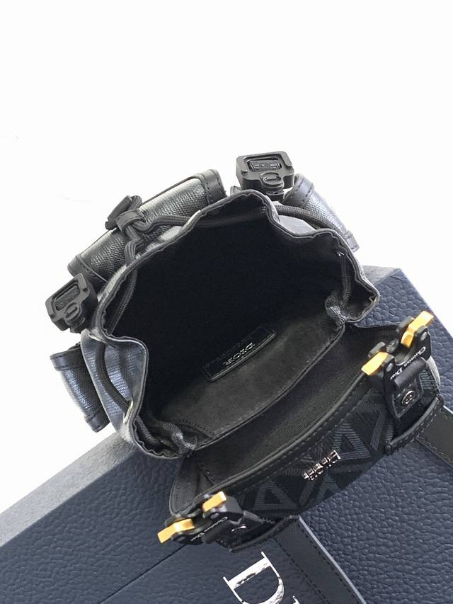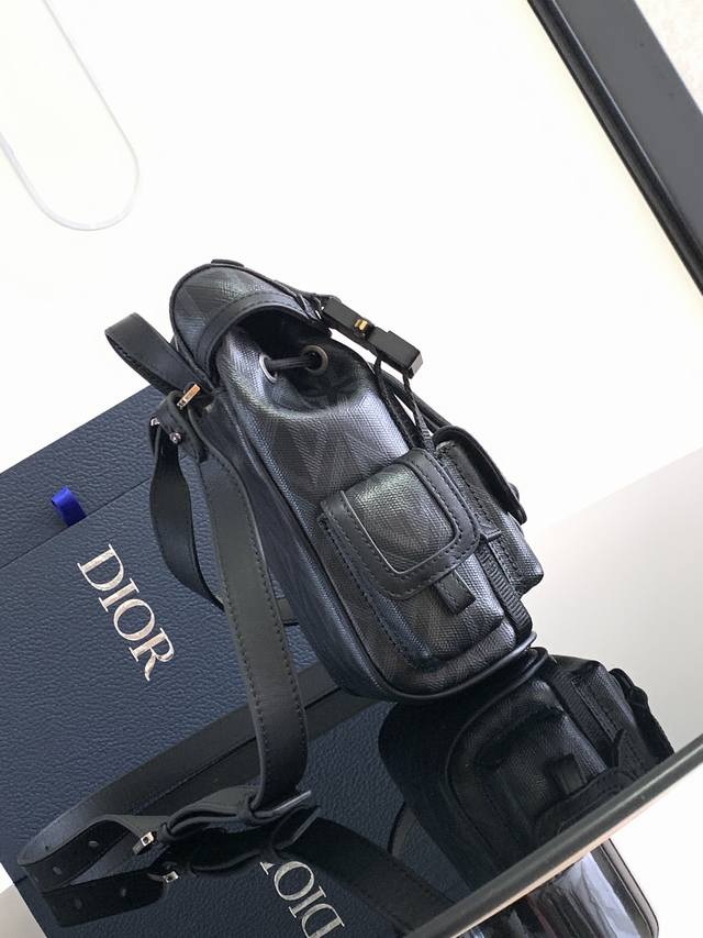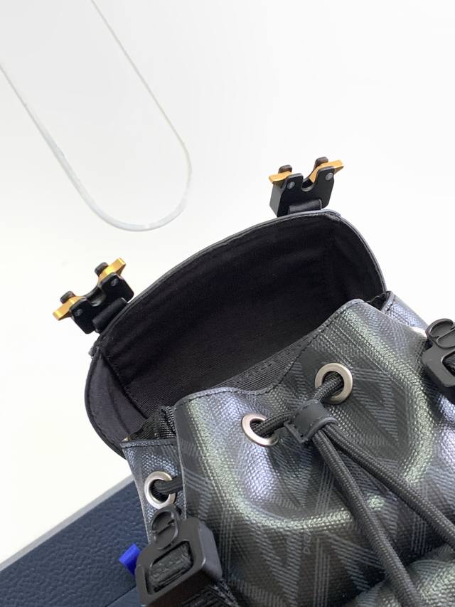 Original background. This Dior Hit The Road mini backpack is a new addition to the Spring 2024 menswear collection, blending modern style with Dior's haute couture spirit. Crafted from black Cd Diamond patterned canvas, it draws inspiration from the Dior archives and is adorned with smooth cowhide leather details. It features two Christian Dior signature nylon jacquard straps, a main compartment, a front flap pocket, and two side flap pockets. It comes with a handle and an adjustable, detachable shoulder strap for hand-carrying or crossbody wear. Black Dior Diamond Pattern Canvas. Designed by Marc Bohan in 1974, the Dior Diamond pattern reinterprets the initial "Cd" with a three-dimensional diamond pattern on cotton canvas. Smooth black cowhide leather. Front features a brass-plated Dior logo. Inside is adorned with the Dior logo. Christian Dior nylon jacquard strap. Flap and drawstring closure. Aluminum buckle with the Christian Dior logo and the initial "Cd". Detachable, adjustable leather shoulder strap. Double-ring buckle at the back for versatile carrying options. Top leather handle. Made in Italy. Dimensions: 17.55 x 18.5 x 9 cm (L x H x W). Main compartment can hold various mobile phones. Front pocket can hold wireless earphones. Item Number: 2Htws018Cdp
