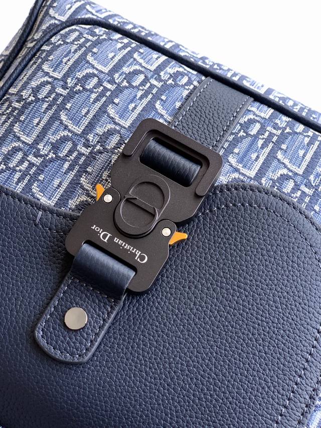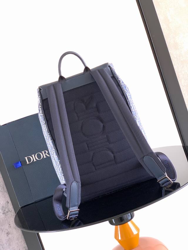 Original Background. This saddle flap backpack features a stylish, original design that highlights the saddle style. Crafted from materials including blue Oblique printed fabric, it's adorned with tonal grained calfskin leather details and the Dior logo on the front. Spacious and compact, it includes a compartment for everyday essentials, and a front saddle flap pocket with an aluminum buckle for easy access to a wallet, keys, earphones, or phone. Practical and versatile, it's the perfect finishing touch to any outfit. Body: Technical fabric, cotton, cowhide leather Lining: Technical fabric, cotton, cowhide leather Main compartment with flap and drawstring Interior flat laptop compartment Front flap pocket with Dior logo buckle Top leather handle Adjustable padded shoulder strap Back with padded mesh fabric and Dior logo Front with metallic copper Dior logo Interior with embossed Dior logo Includes dust bag Item Number: 1Adba200 Dimensions: 26.5 x 41 x 14 cm (L x H x W) Main compartment can hold one 15-inch laptop, documents, and one tablet.