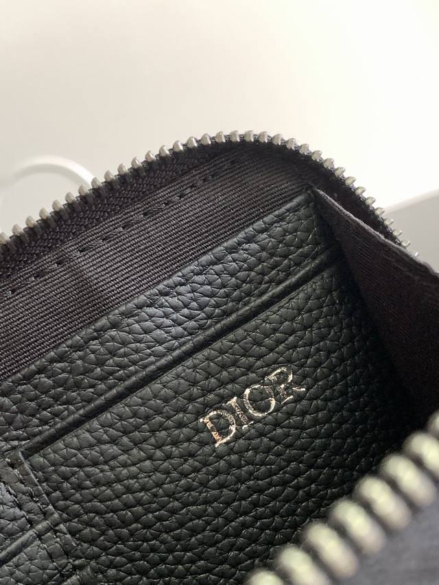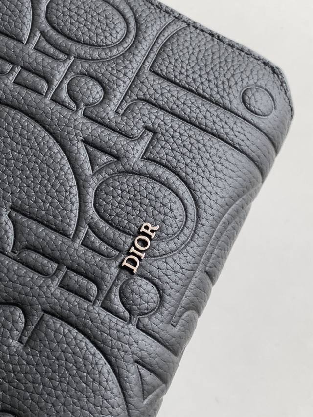 Original background. This zip-up clutch with shoulder strap is elegant and practical, capable of holding various everyday essentials. The Dior Gravity printed leather features an embossed pattern that exquisitely presents the classic Dior pattern on black calfskin, adorned with the Dior logo on the front, showcasing the Dior atelier's superb craftsmanship. A two-way zip closure at the top, along with a zip pocket with triangular lining, blends elegance and practicality for a sophisticated look. The adjustable, detachable shoulder strap, embellished with the Christian Dior logo , can be carried on the shoulder, crossbody, or by hand. The interior is crafted from smooth cowhide leather and nylon. Features include: double zippered compartments, interior slip pockets, four card slots, an adjustable and detachable Christian Dior nylon jacquard shoulder strap with a lobster clasp, a front-mounted brass Dior logo, an embossed Dior logo on the interior, and an included dust bag. Model: 22412 (Full Leather Embossed 2Esbc119). Dimensions: 17 x 12.5 x 5 cm.