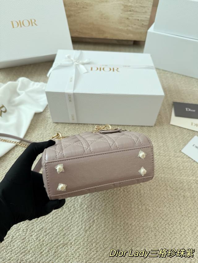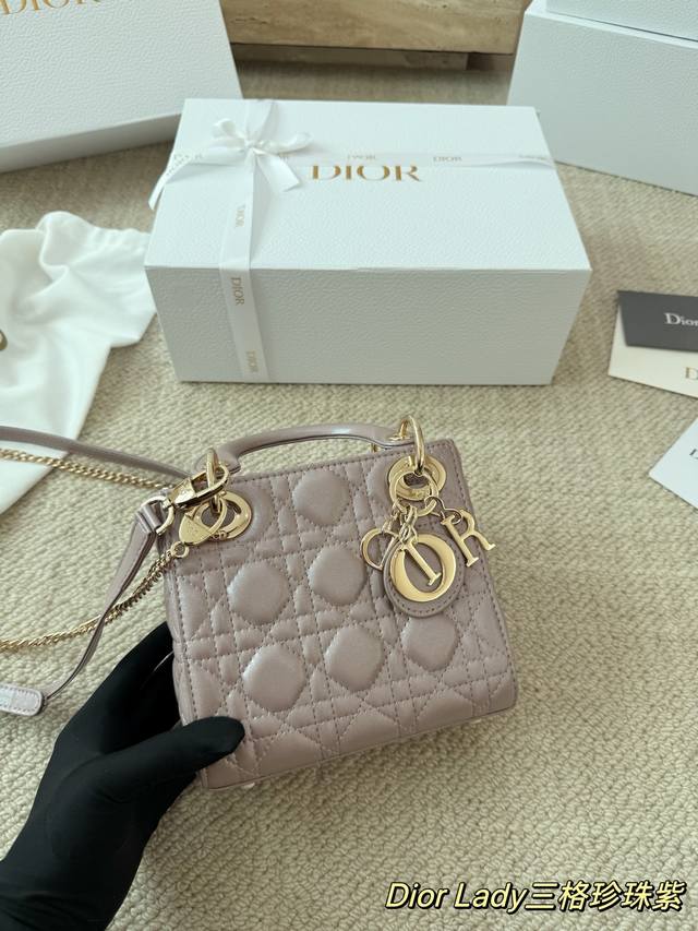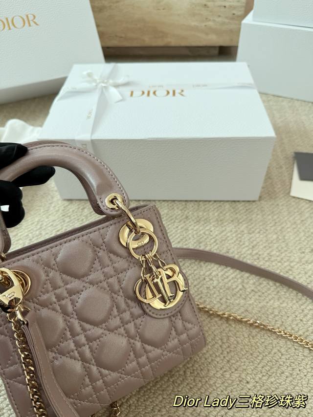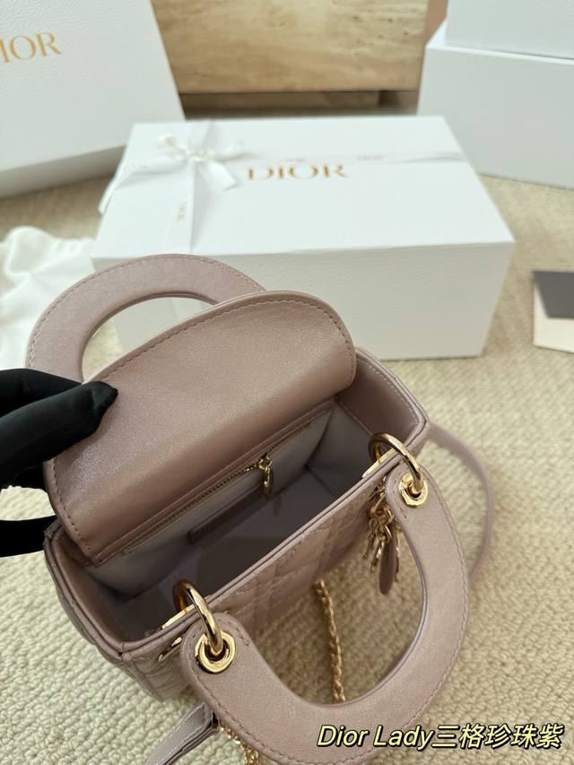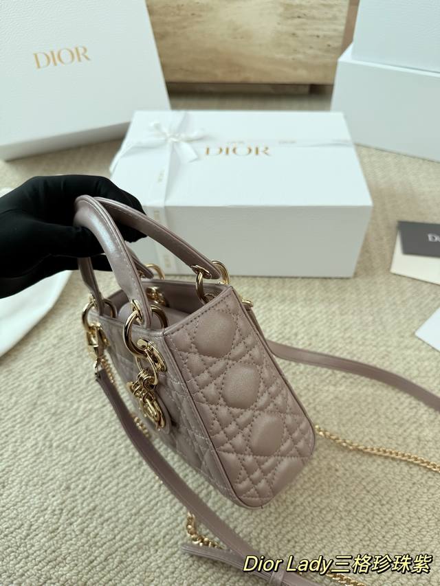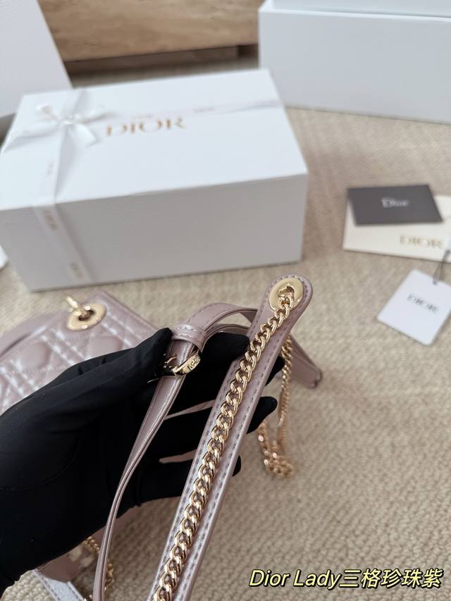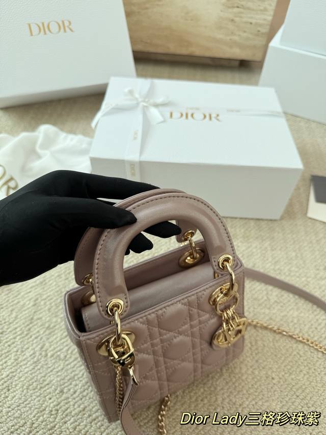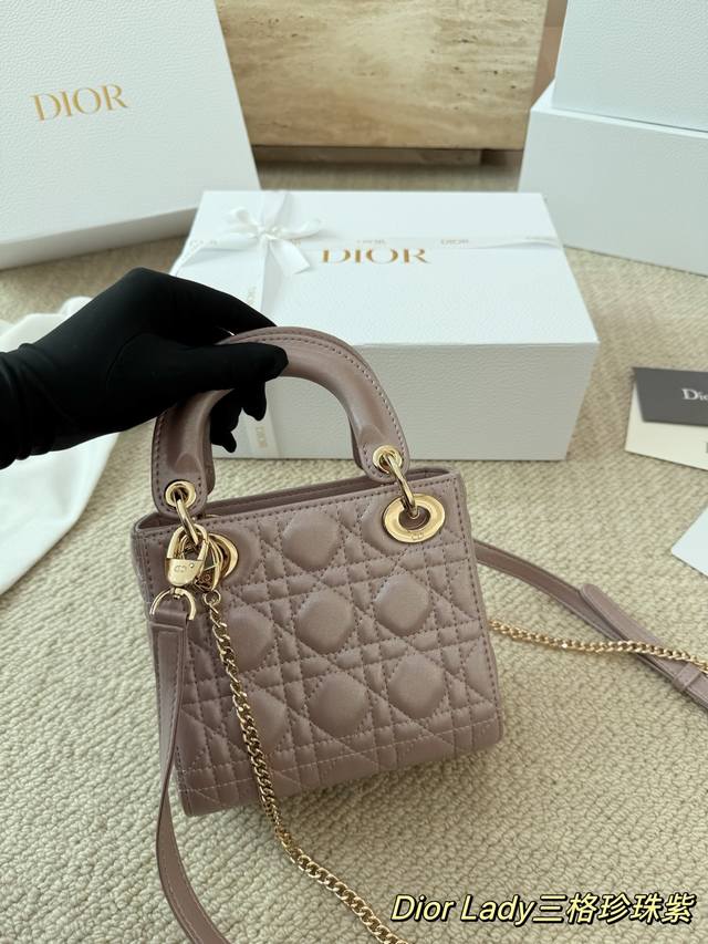 Replica Dior Lady Handbag in Pearl Purple Lambskin Texture. The Lady Dior bag is truly a dream bag, the same style worn by Zhou Yangqing. The matte finish is incredibly sophisticated and elegant, simple yet understated. The bag has a structured shape that won't collapse or dent. It has a moderate capacity, perfect for everyday essentials, not just a tip bag. Versatile and versatile, it can be worn crossbody, over the shoulder, or carried by hand. Size: 17-15cm.