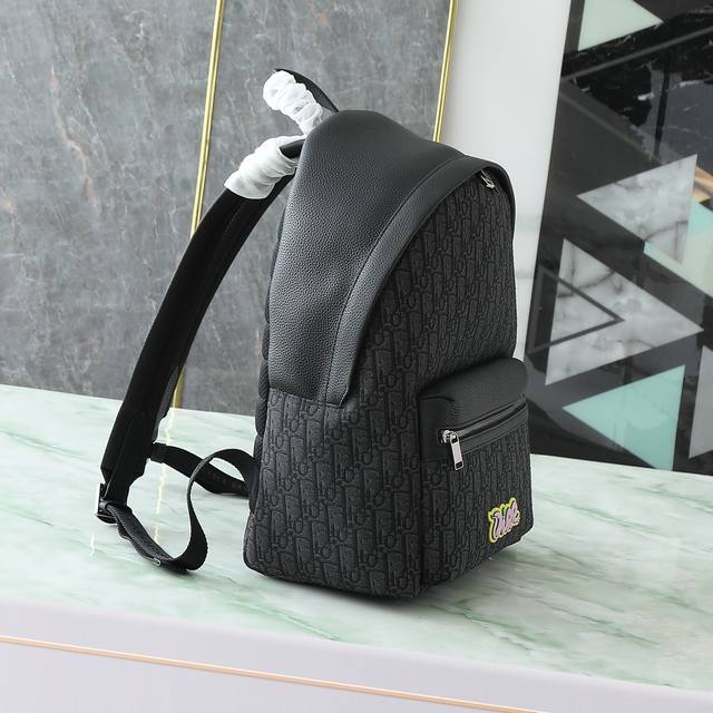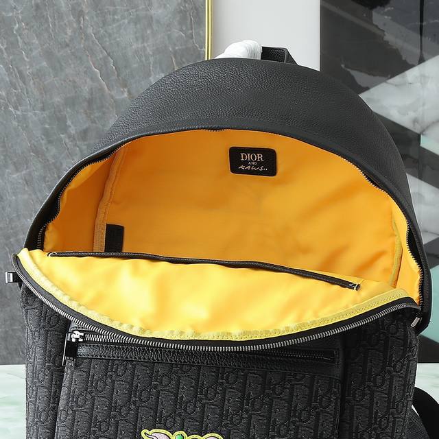 Rider 2.0 zip-up backpack is from the Dior And Kaws limited edition collection. Crafted from black grained calfskin and other materials, it features a large front zip pocket adorned with a tonal Oblique print, complemented by pink and yellow Dior And Kaws rubber patches for a touch of sophistication. The colorful snake motif reinterprets the Dior logo. With a two-way zip closure and adjustable padded shoulder straps, it's the perfect everyday bag. Body: Technical fabric, cotton, cowhide leather Lining: Cotton, cowhide leather, technical fabric Main zippered compartment Interior flat laptop compartment Interior slip pocket Front zippered pocket Top leather handle Adjustable padded shoulder strap Back padded mesh fabric with Dior logo Pink and yellow Dior and Kaws rubber patch Interior embossed Dior logo Dimensions: 32 x 43 x 19 cm Item Number: 1Esba199Oup_45H368