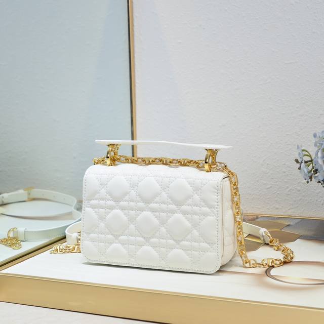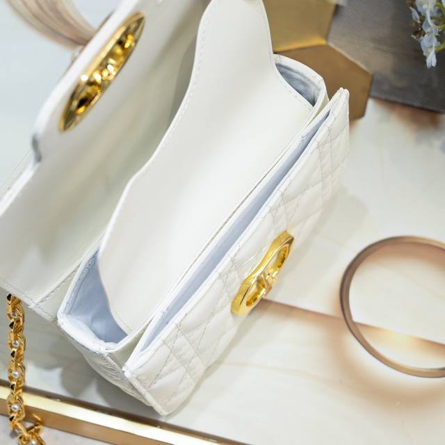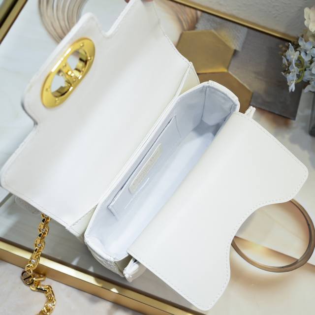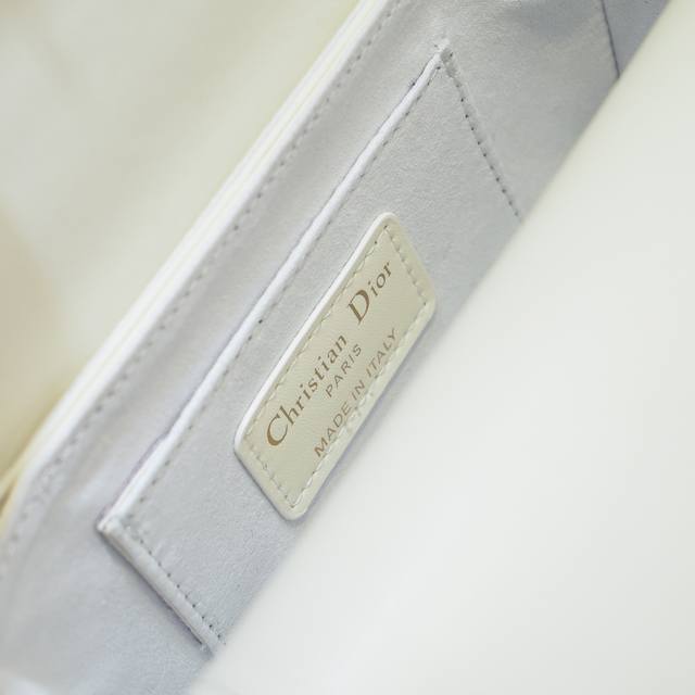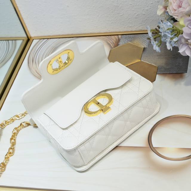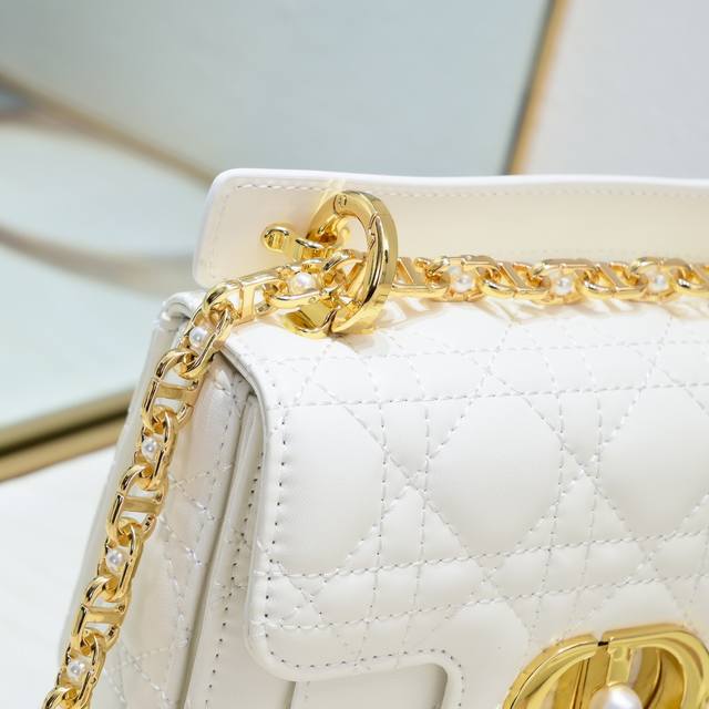 This Dior Jolie handbag is a new product from the 2024 Spring/Summer ready-to-wear collection, combining elegance and practicality. It is carefully crafted from white cowhide leather and decorated with rattan check stitching. The double flap is decorated with the Cd logo to enhance the style and is embellished with white resin beads. The three compartments and zipper pockets can store various daily necessities and can be matched with daily or evening looks. The small style is equipped with a detachable handle and a detachable chain shoulder strap. The shoulder strap is composed of a leather strap and a Cd logo chain link, decorated with white resin beads, which can be comfortably carried by hand [6]