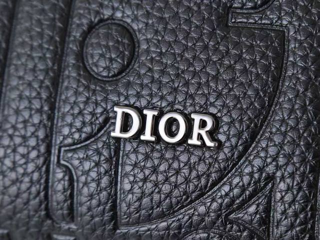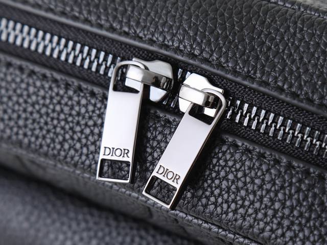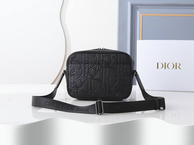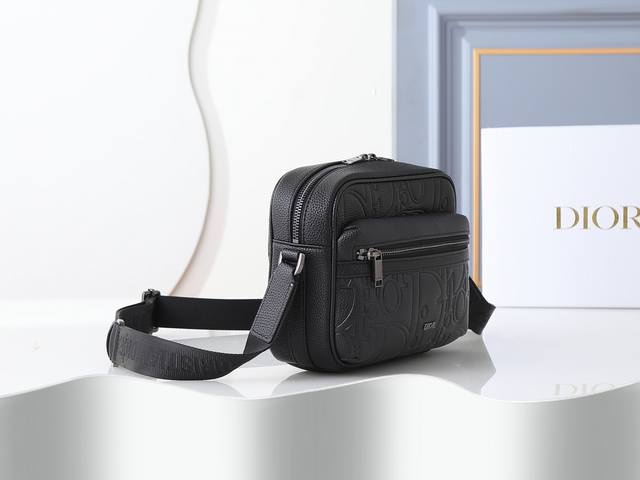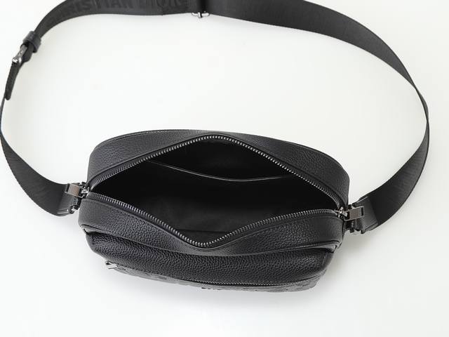 Style No. 0 Black embossed zip-up messenger bag, with tonal calfskin leather details and the Dior logo on the front, and an adjustable buckle shoulder strap for shoulder or crossbody wear. Dimensions: 23cm-17cm-7.5cm DDD