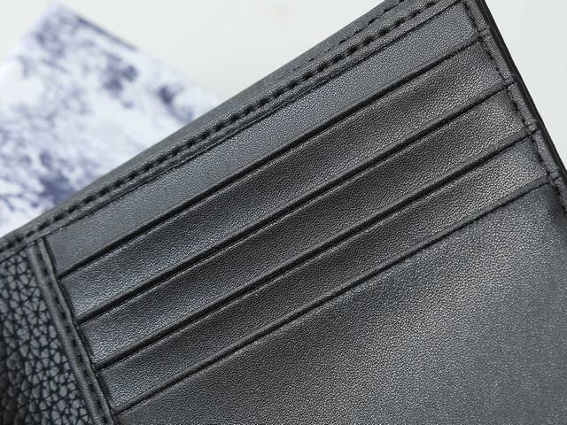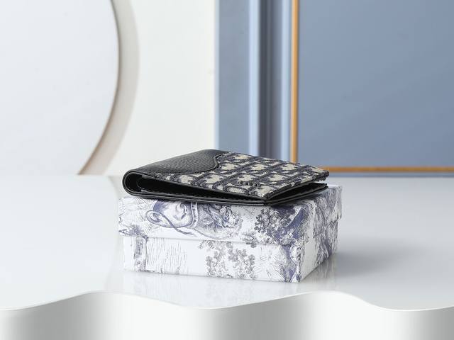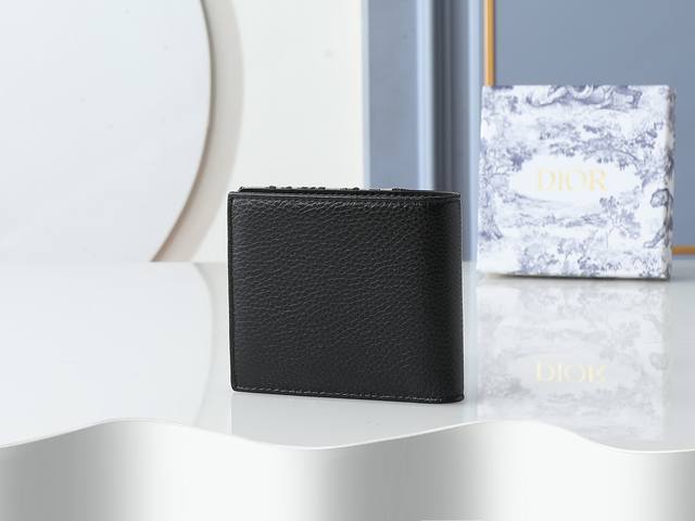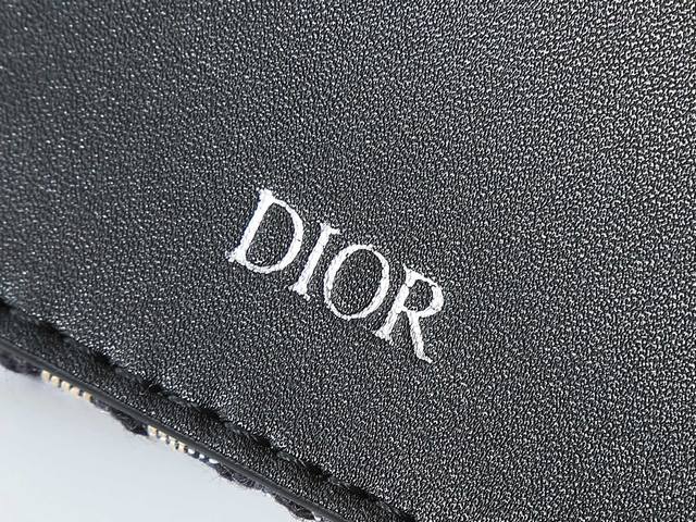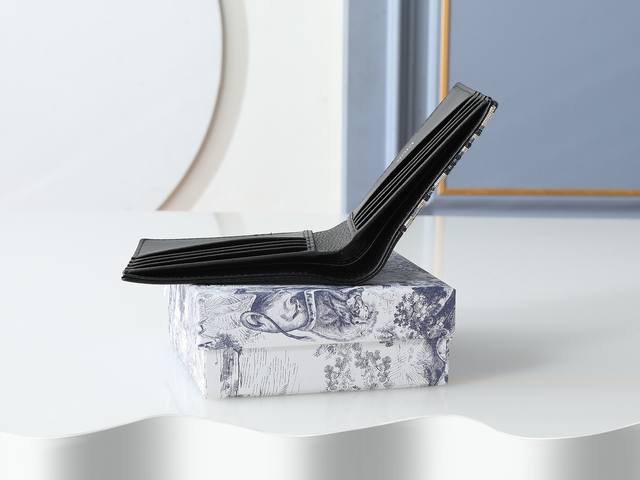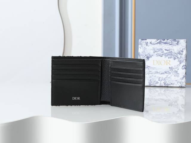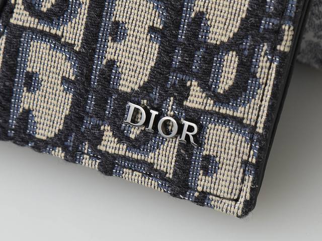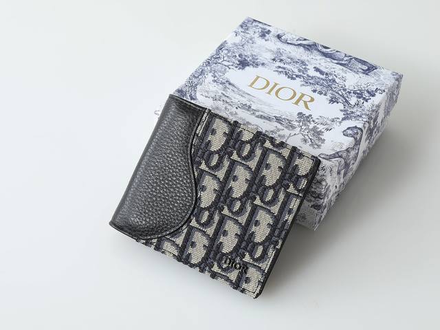 Style No. 076 is carefully crafted with black cowhide and beige Oblique printed fabric, decorated with metal-coated copper alloy Dior logo on the front, two flat compartments and eight card slots, bi-fold style, size: 11.5Cm-9.5Cm