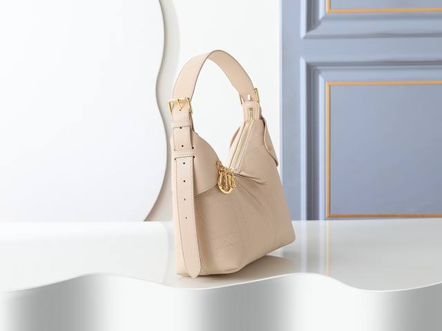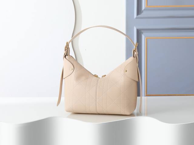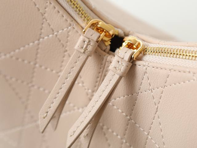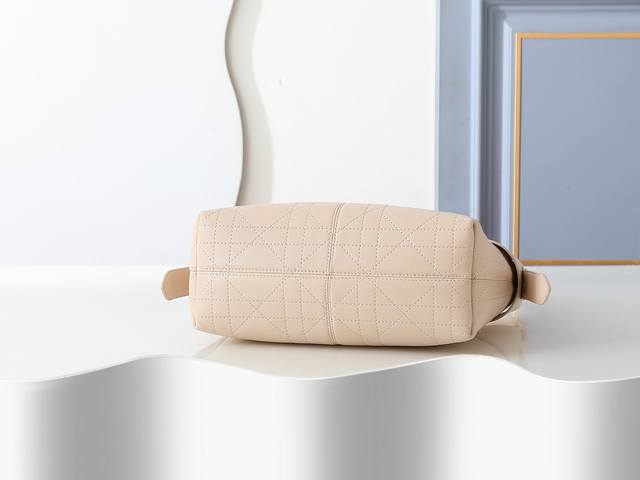 Style No. 2846 Medium Rouge Beige Dior Voyage handbag is crafted from beige pleated calfskin and features flat, oversized cannage stitching. The main compartment has a secure, practical two-way zip closure, and the top handle has an adjustable buckle. It can be carried over the shoulder, making it an ideal everyday companion. Dimensions: 28cm-18cm-12cm