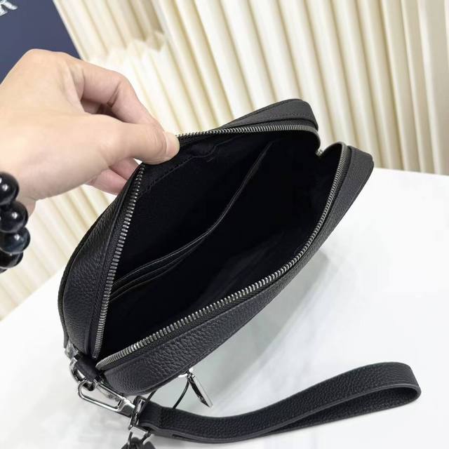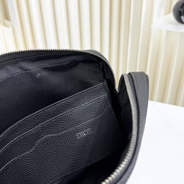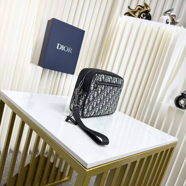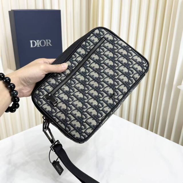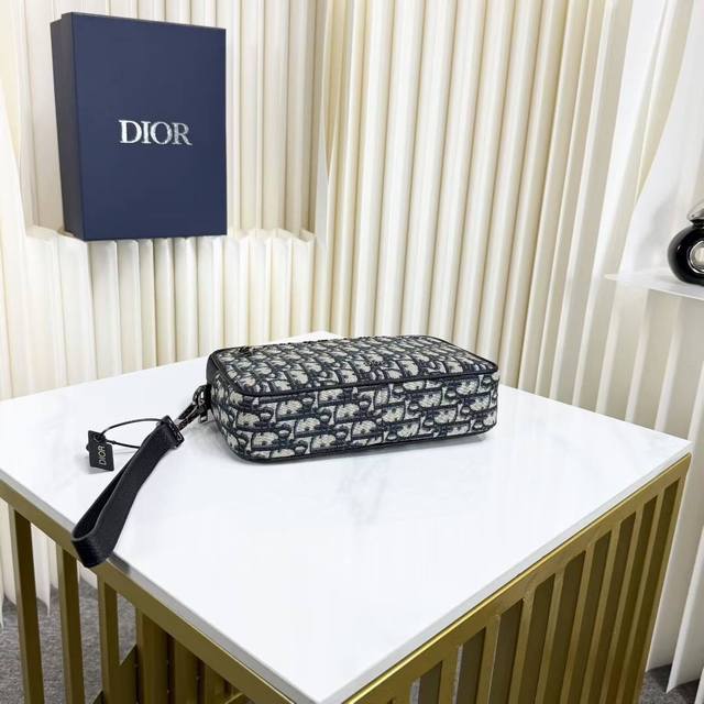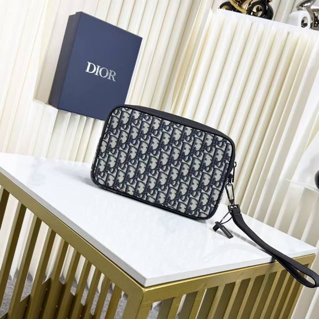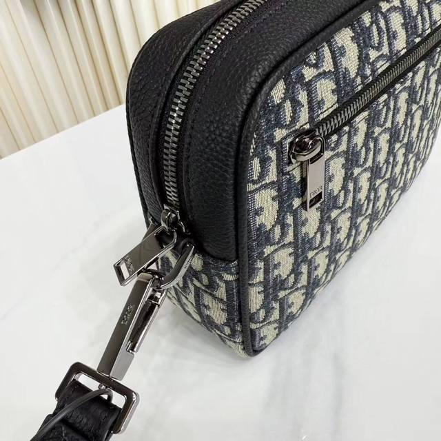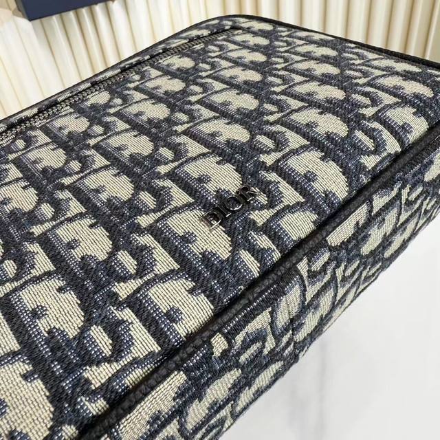 This wash bag is practical and sophisticated. Crafted from beige and black jacquard Oblique print, it is decorated with black grained cowhide leather trim and decorated with Dior logo on the front. Spacious compartments with zipper closure and a zipper pocket on the front. With a detachable leather wristlet, it is easy to carry or put in the handbag.