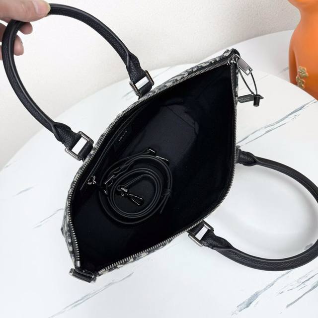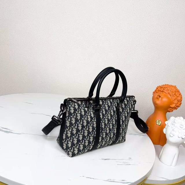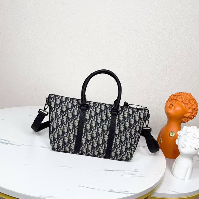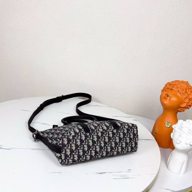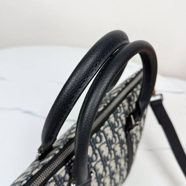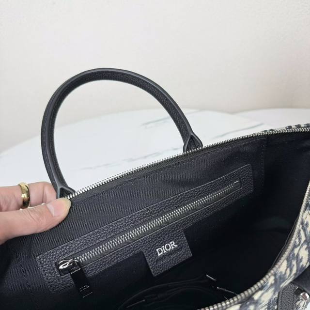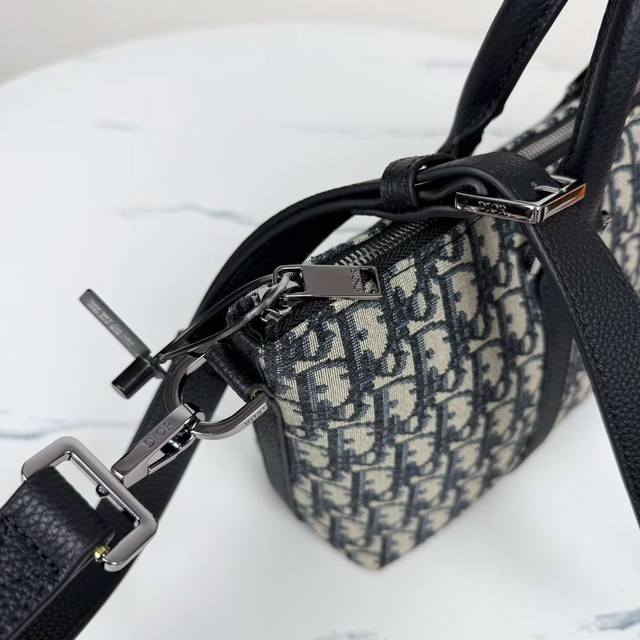 This Weekender 25 handbag embodies timeless elegance. Crafted from beige and black Oblique print fabric, it features a new interpretation of the classic Dior pattern, enhanced with black grained calfskin details and a Dior signature on the front. It features a spacious main zippered compartment for everyday essentials. The adjustable and detachable shoulder strap and leather top handle allow it to be carried by hand or on the shoulder.