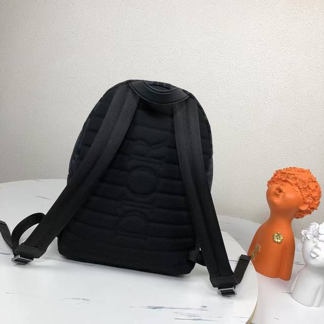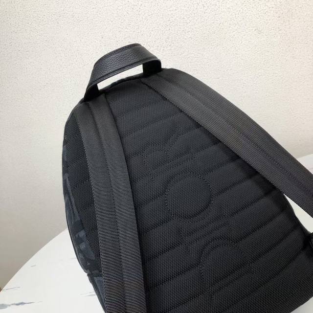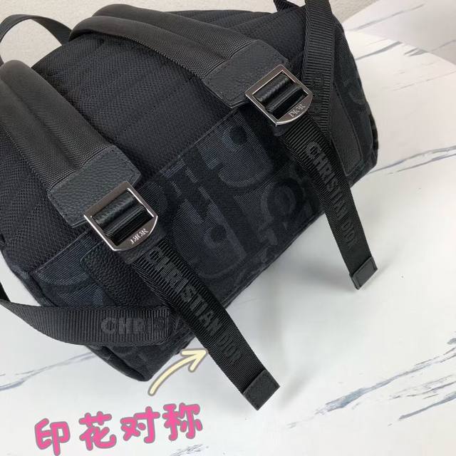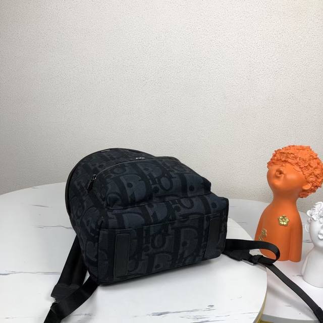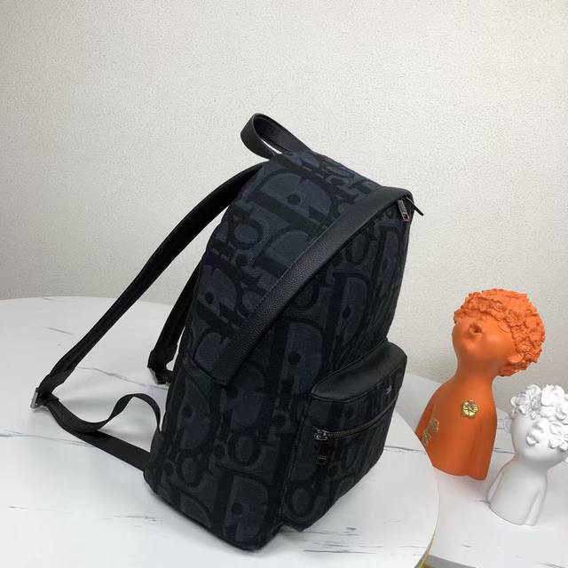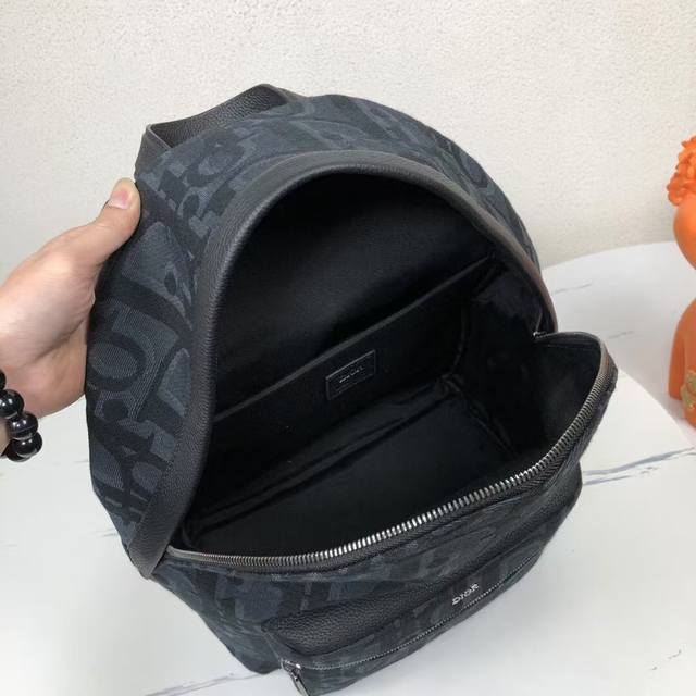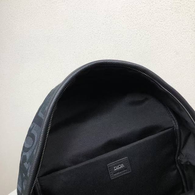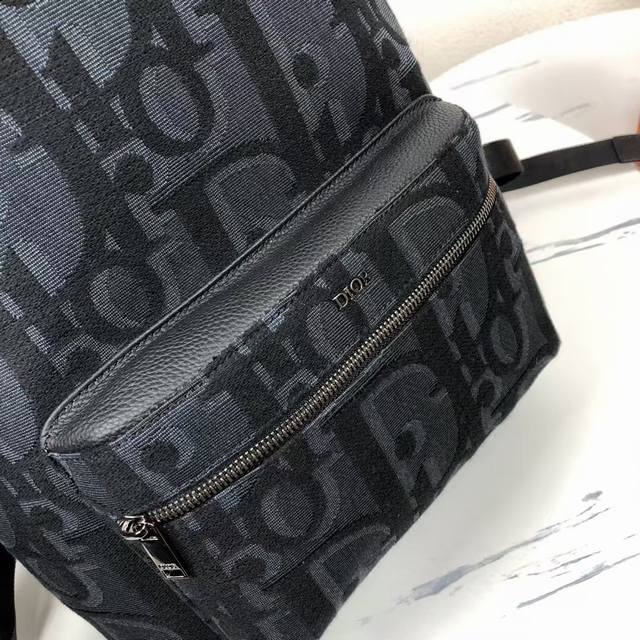 Rider backpack exudes understated beauty, reminiscent of a classic school backpack. Crafted from black Maxidioroblique jacquard, it features a new interpretation of the House of Dior's signature motif, accented with smooth calfskin detailing and the signature Dior motif on the front. Details such as a two-way zipper closure, a large front zippered pocket, and an adjustable padded strap complete the look of this perfect everyday piece.