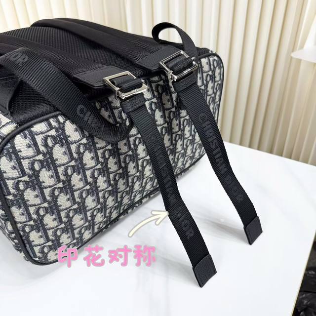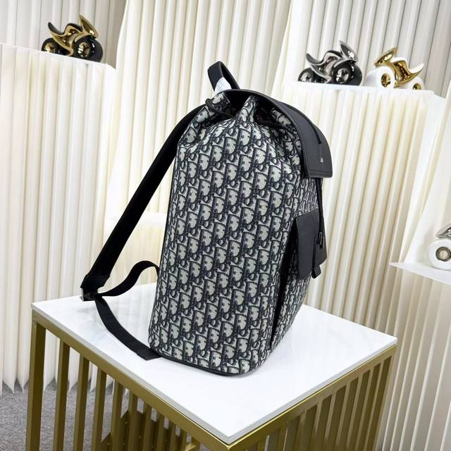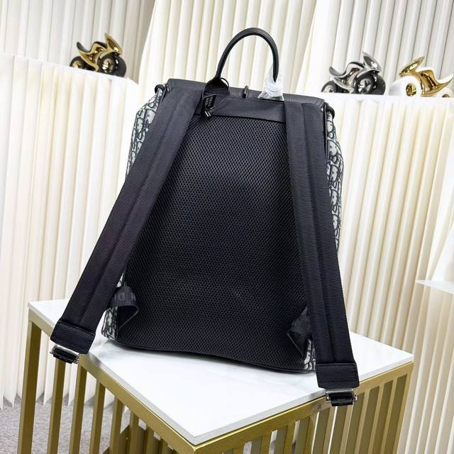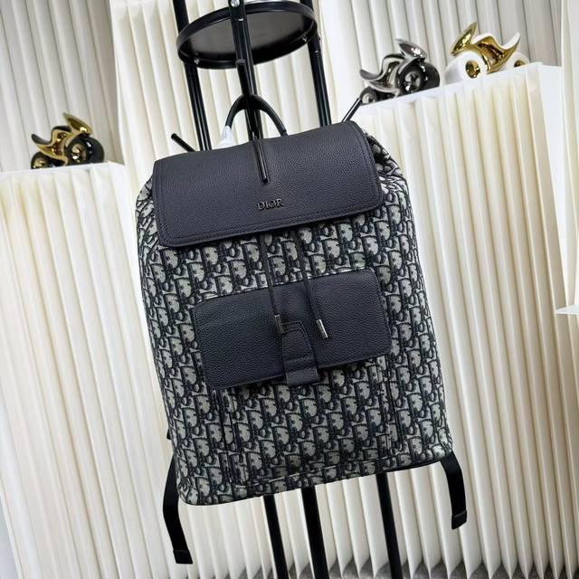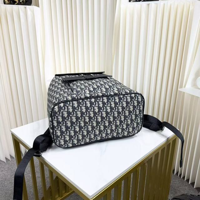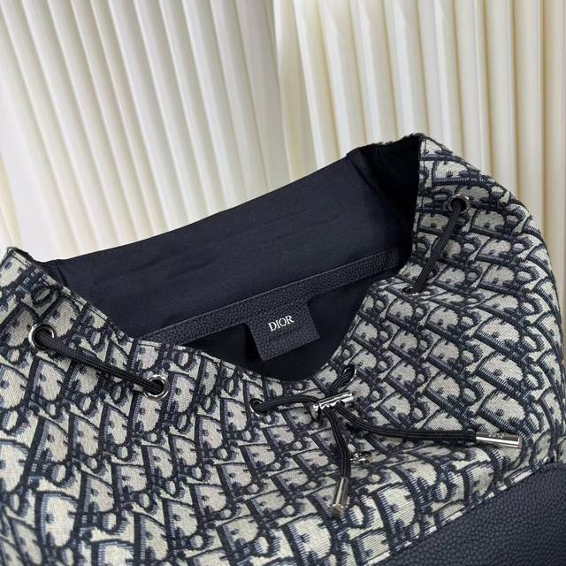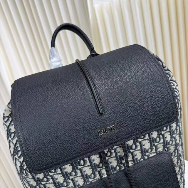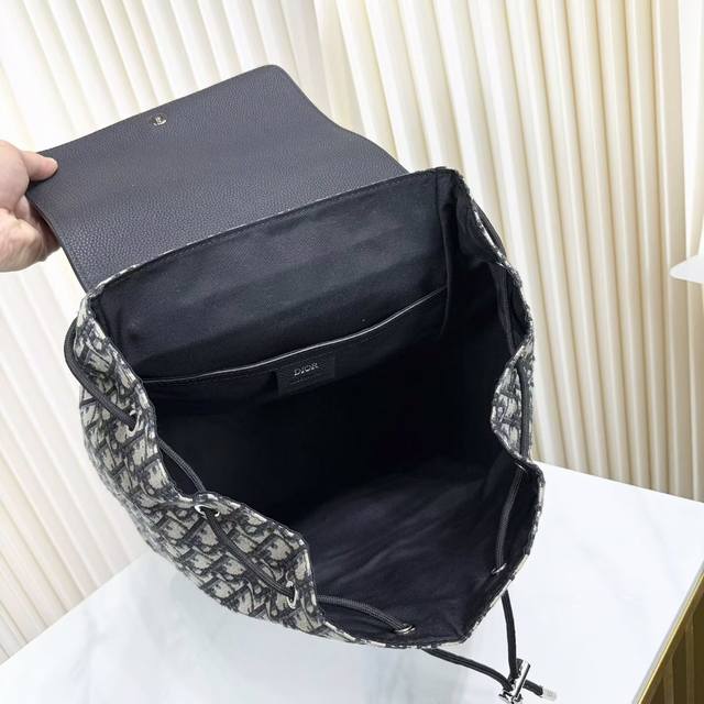 is a smart accessory, the Motion Backpack. The clean silhouette creates a modern feel, while the beige and black Dior Oblique pattern adds a stylish touch. The jacquard material is embellished with black grained calfskin and features a loose, practical interior. The top handle and adjustable double quilted strap at the back allow for two different styles.