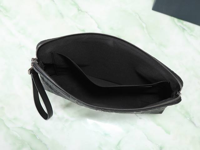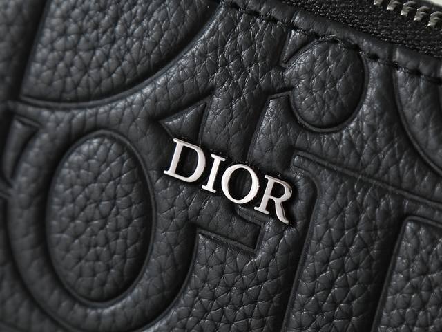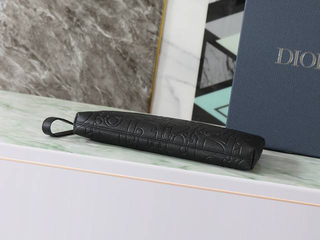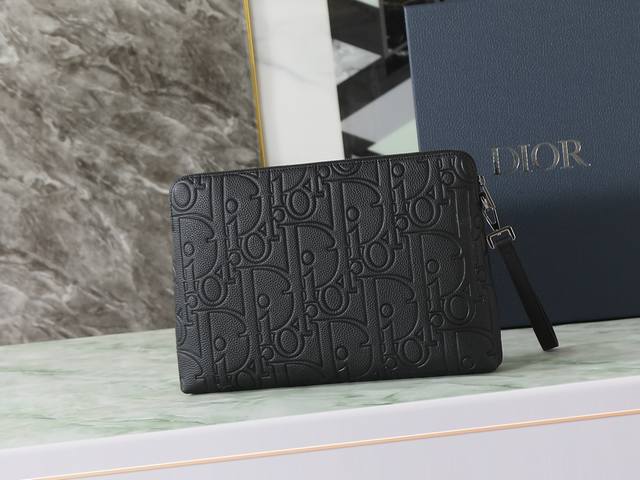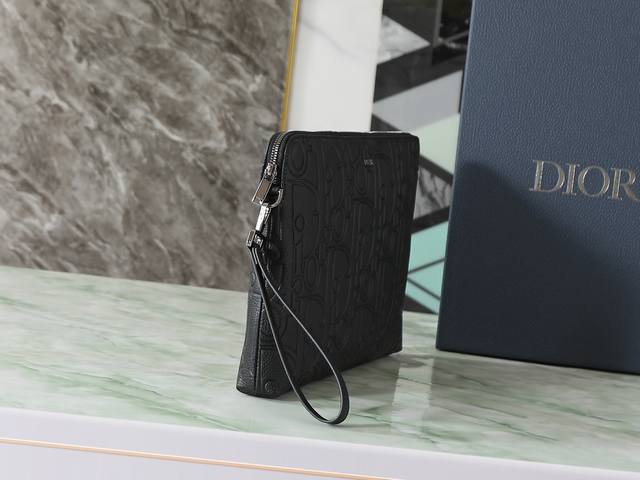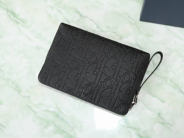 This A4 zip clutch is a signature Dior piece. Crafted from Dior Gravity printed leather, the classic Dior pattern is exquisitely presented on black calfskin using an embossing technique. The front is adorned with the Dior logo, showcasing the Dior atelier's exceptional craftsmanship. The spacious zip compartment features three card slots and two slip pockets. It comes with a detachable grained calfskin wrist strap, allowing it to be carried by hand or placed inside the bag. Model: 2Esca421Llg_H00N Dimensions: 35 x 24 x 4.5 cm (L x H x W) Fits a 13-inch laptop, a tablet, and A4 documents. Body: Cowhide leather. Lining: Technical fabric, cotton, and cowhide leather. Zippered main compartment. Two internal slip pockets. Three smooth cowhide leather card slots. Removable grained cowhide leather wrist strap. Front adorned with a metallic copper alloy Dior logo. Interior adorned with an embossed Dior logo. Includes a dust bag.