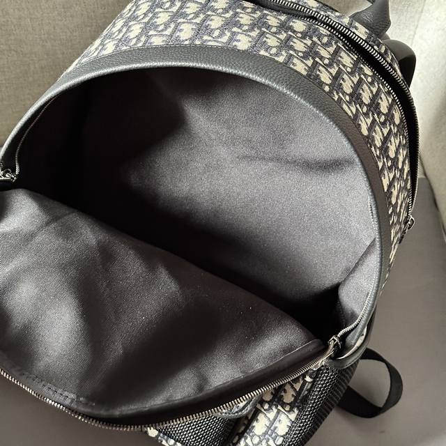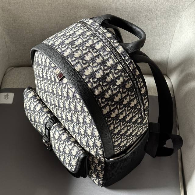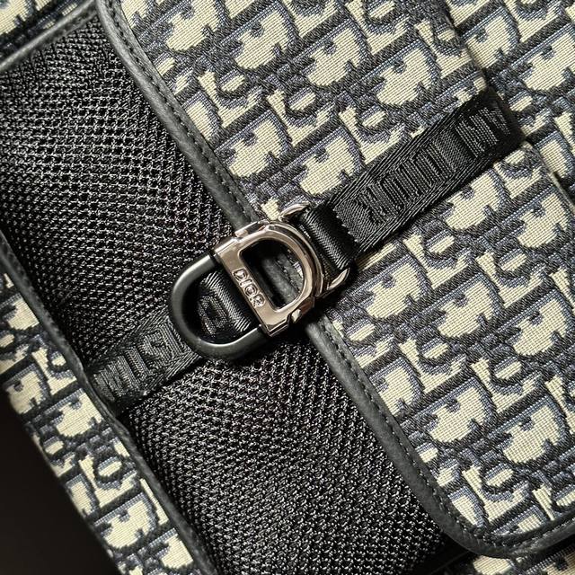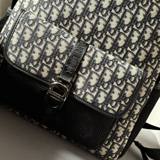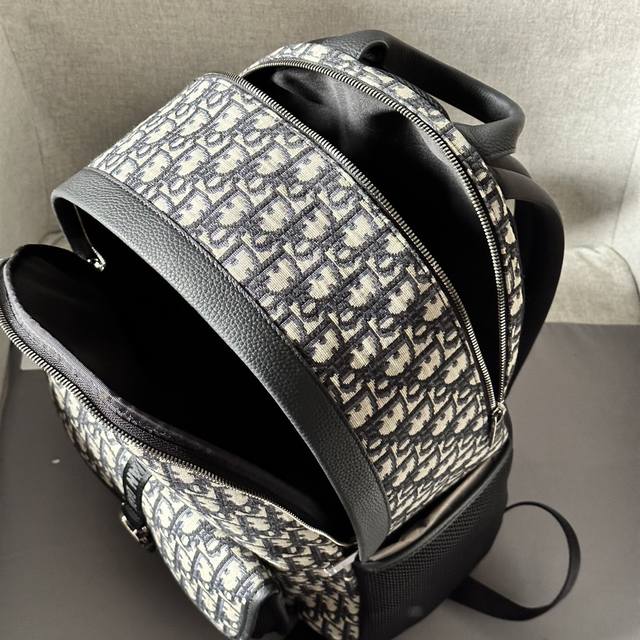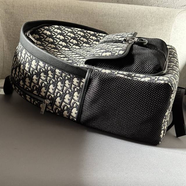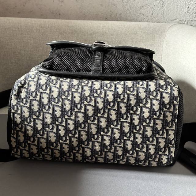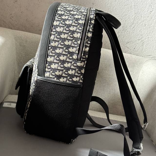 This Dior 8 backpack is a new addition to the Spring 2024 menswear collection, featuring a stylish and modern design with a touch of elegance. Crafted in beige and black Oblique print, it boasts a spacious main compartment for essentials. A zippered laptop pocket is located at the back, while the front features a jacquard and mesh fabric pocket with a Dior 8 snap flap for added sophistication. Side pockets are also included. This practical backpack complements various styles. DDD Beige and black Oblique print Front metal-coated brass Dior logo Interior Dior embossed logo Top zip closure Adjustable padded shoulder straps Leather top handle DDD Back reinforced with quilted technical knit fabric and Dior logo Front technical knit fabric pocket with flap and Dior 8 snap Side patch pockets DDD Laptop zippered compartment DDD Model 8859 DDD Dimensions 31-41-15 DDD _ DDD