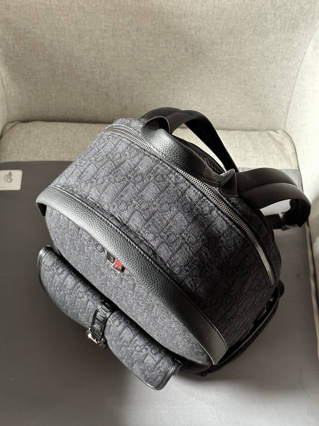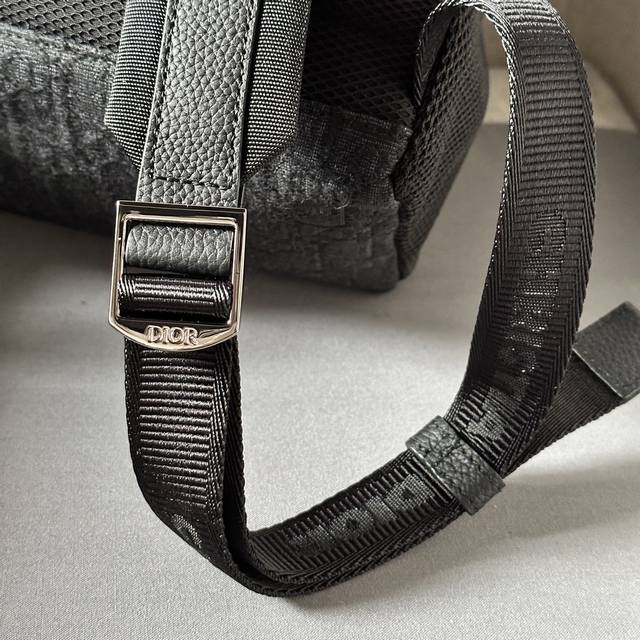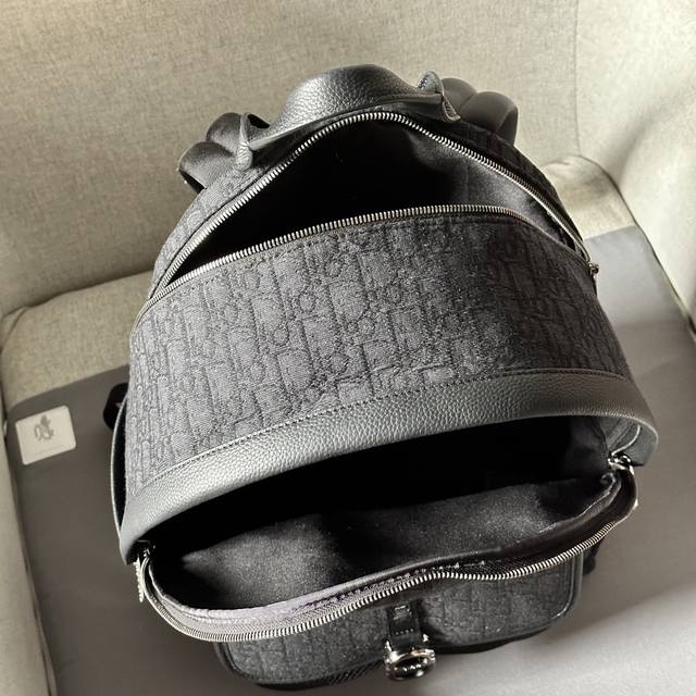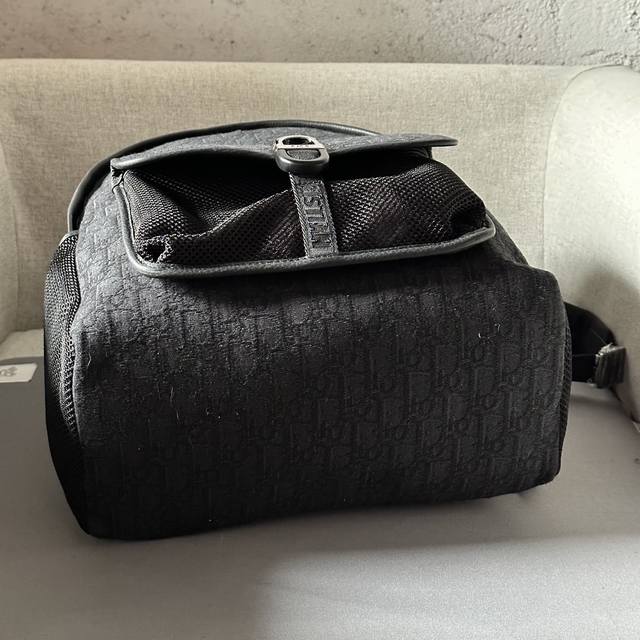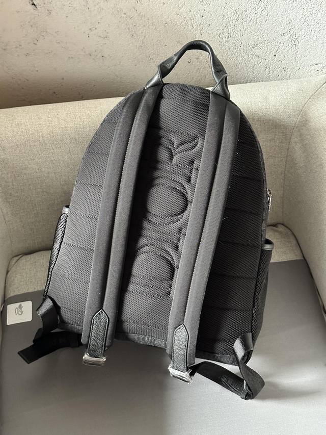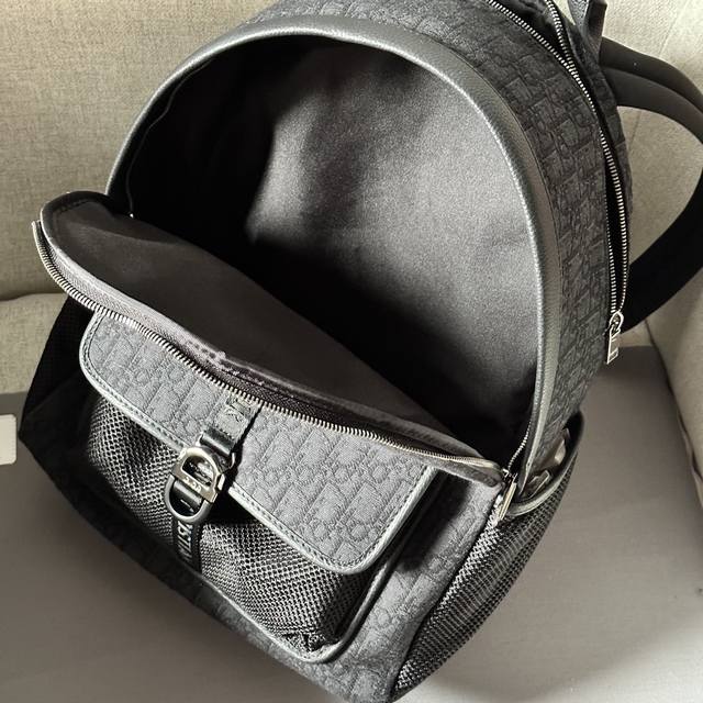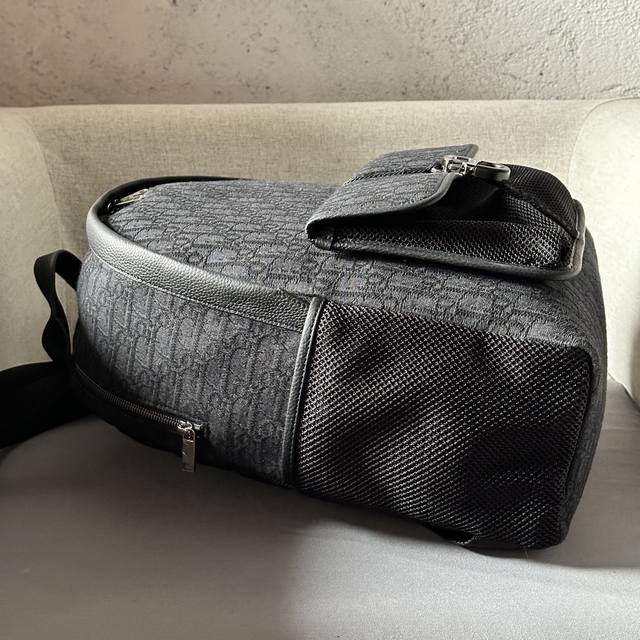 This Dior 8 backpack is a new addition to the Spring 2024 menswear collection, featuring a stylish and modern design with a touch of elegance. Crafted in black Oblique print, it boasts a spacious main compartment for everyday essentials. A zippered laptop pocket is located at the back, while the front features a jacquard and mesh fabric pocket with a Dior 8 snap flap for added sophistication. Side pockets are also included. This practical backpack complements various styles. Black Oblique print. Front metal-coated brass Dior logo. Inside Dior embossed logo. Top zip closure. Adjustable padded shoulder straps. Leather top handle. Back reinforced with quilted technical knit fabric and Dior logo. Front technical knit fabric pocket with flap and Dior 8 snap. Side patch pockets. Notebook compartment with zipper. Model 8860. Dimensions 31-41-15.