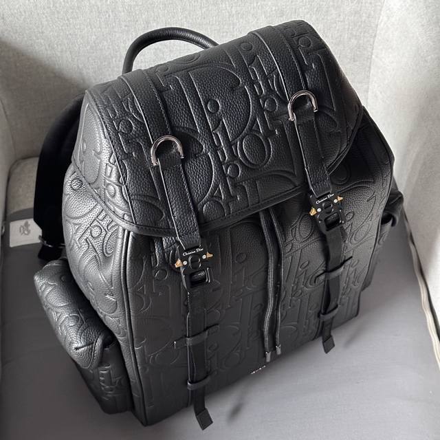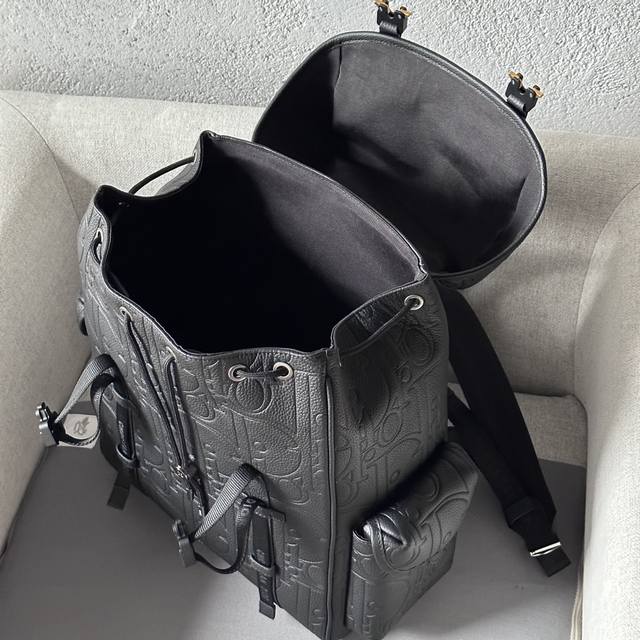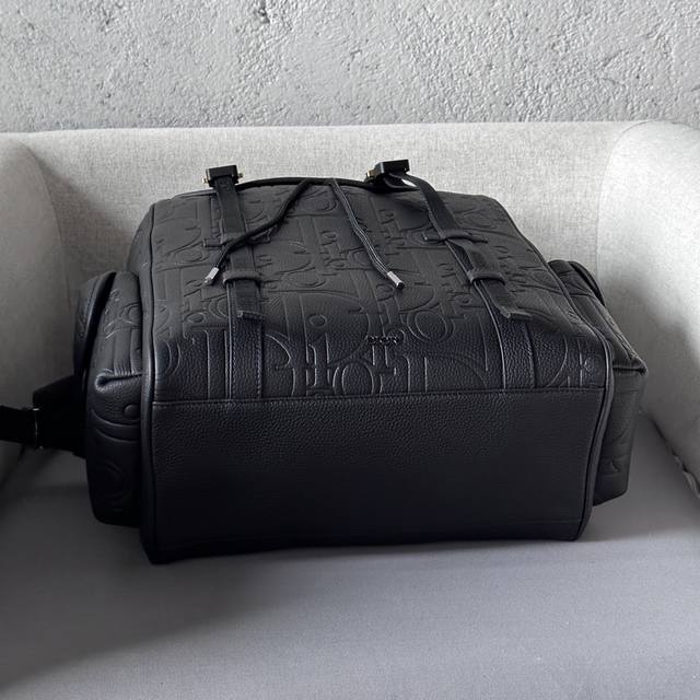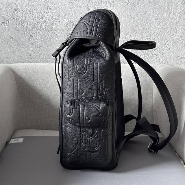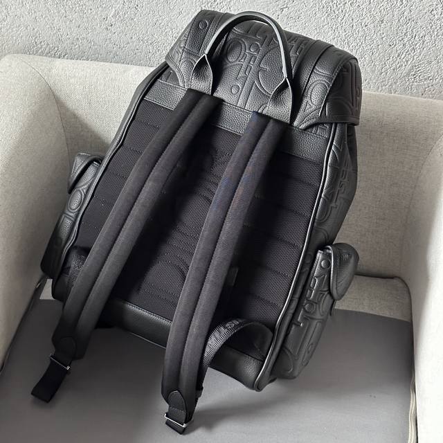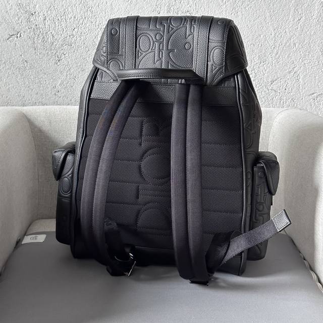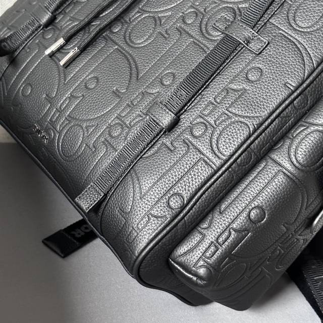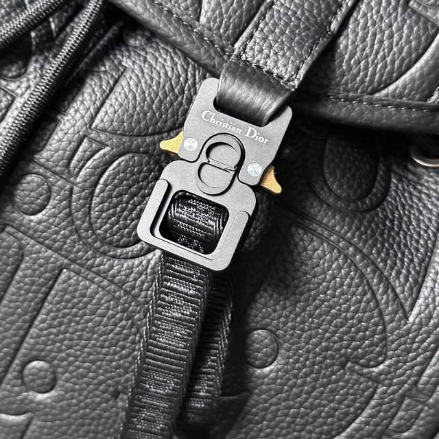 This Dior Hit The Road flap backpack seamlessly blends modern style with Dior's haute couture spirit. The Dior Gravity printed leather features an embossed design that exquisitely presents the classic pattern on black calfskin, accented with black grained calfskin details. The front is adorned with the Dior logo, showcasing the Dior atelier's exceptional craftsmanship. It includes two Christian Dior signature nylon jacquard straps, a spacious main compartment with a flap, and two magnetic flap pockets on the sides. Practical in design, it pairs well with various casual looks. DDD Model 8968 DDD Size 43-43-18 DDD Nylon interior DDD Main compartment with flap and drawstring interior flat laptop compartment Side magnetic flap pockets Leather top handle Adjustable padded shoulder strap DDD Dior logo aluminum buckle and D-ring DDD Padded mesh back with Dior logo Front with metal-coated brass Dior logo Embossed Dior logo Includes dust bag Made in Italy DDD