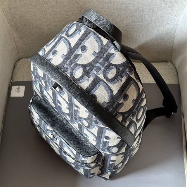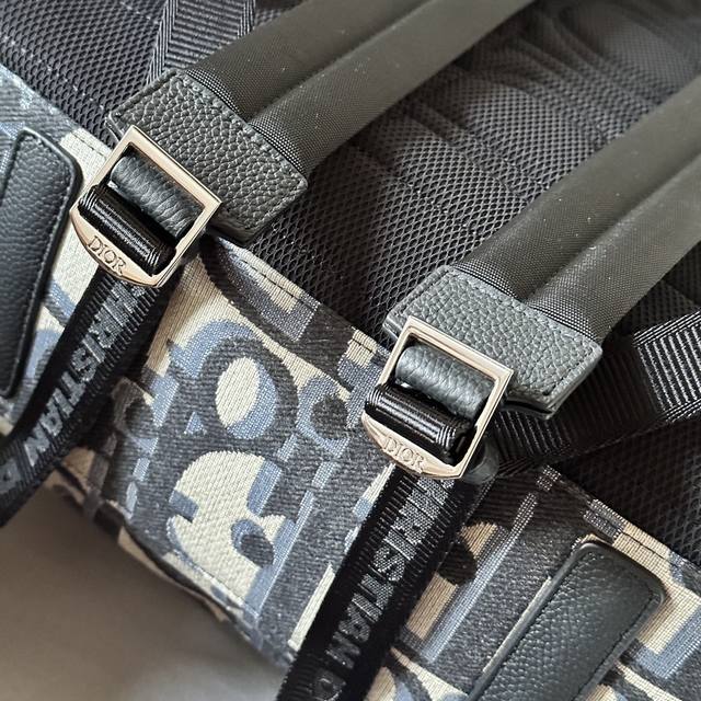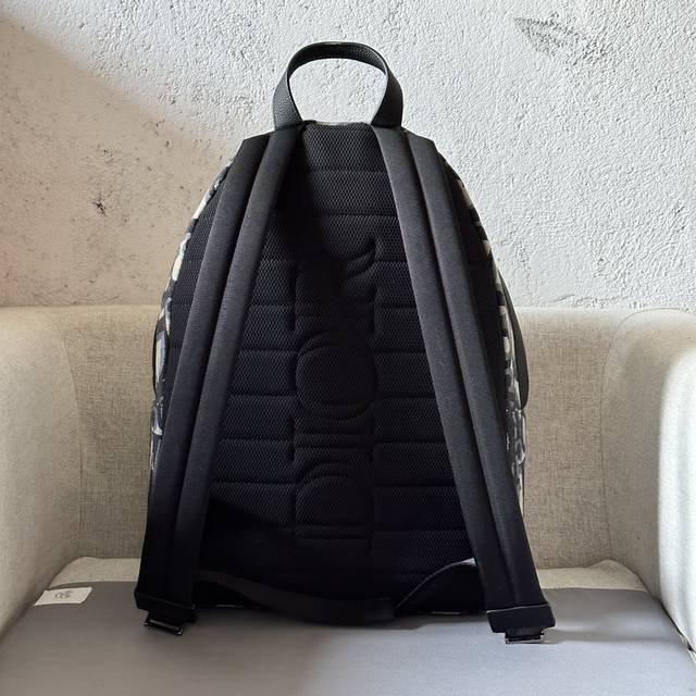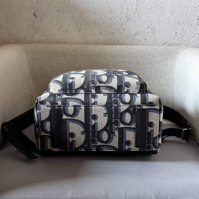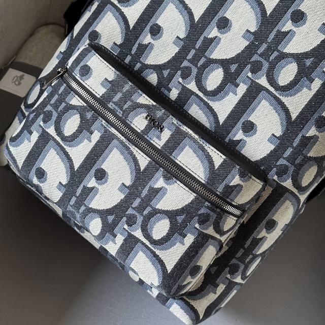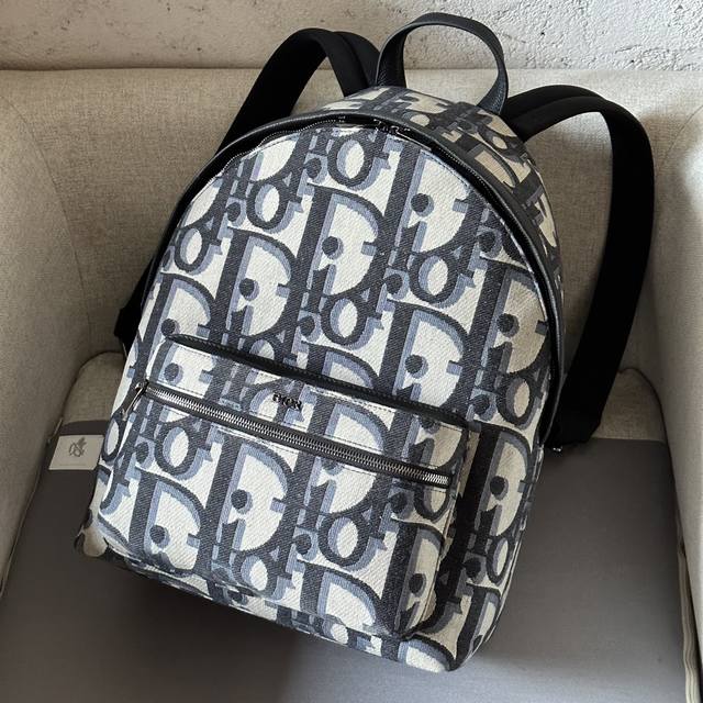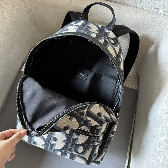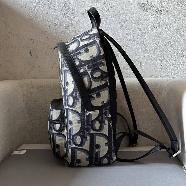 This Rider backpack boasts a minimalist style, with a classic preppy design exuding vitality. Crafted from beige and black oversized Oblique print fabric, it reinterprets the classic Dior pattern, adorned with smooth calfskin details and a prominent Dior logo on the front for added sophistication. Continuing the classic design, it features exquisite details such as a two-way zip closure, a large front zip pocket, and adjustable padded shoulder straps, making it an ideal choice for everyday wear. DDD Beige and black oversized Oblique print, front metallic brass Dior logo, interior Dior embossed logo, two-way zip closure, adjustable padded shoulder straps, leather top handle. DDD The back of the bag is reinforced with quilted technical knit fabric and adorned with the Dior logo. Front zip pocket and interior slip pocket. Includes dust bag. Made in Italy. DDD Model 8961 DDD Dimensions 30-42-15 DDD