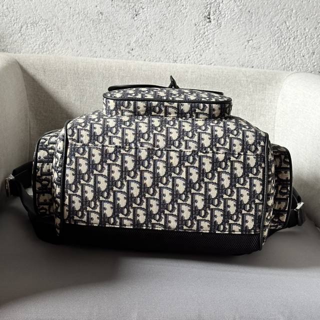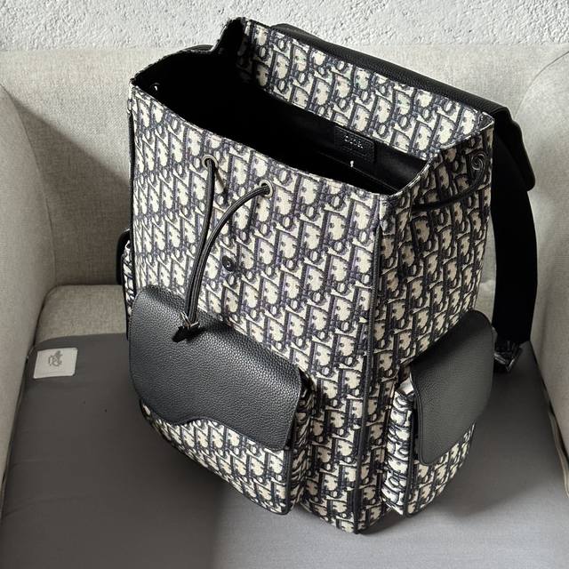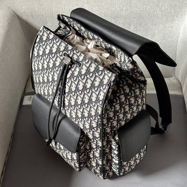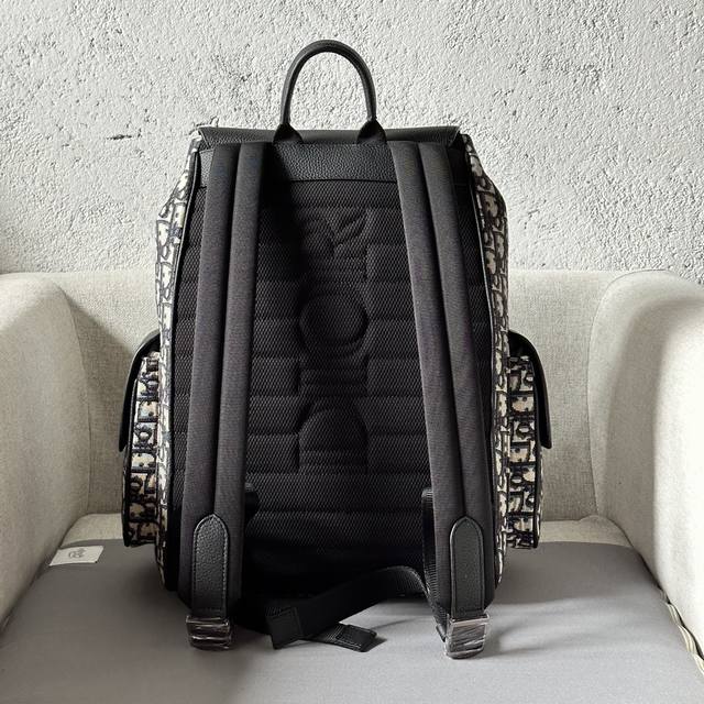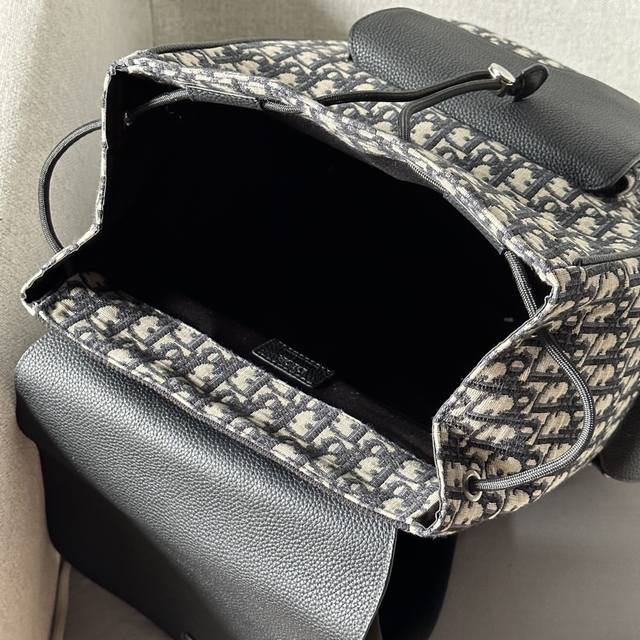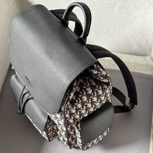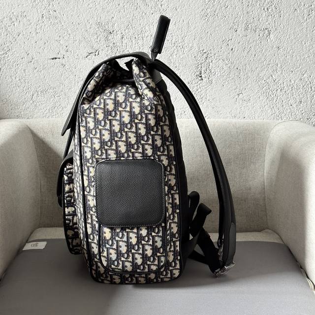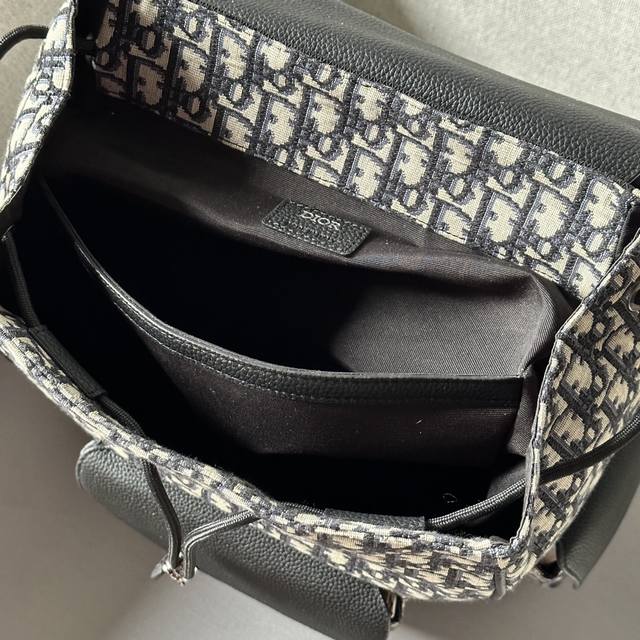 This saddle backpack features a stylish, original design that highlights the saddle style. Crafted from beige and black Dior Oblique jacquard fabric, it's finished with black grained calfskin details and a Dior logo on the front. Spacious, it includes compartments for everyday essentials, a front flap saddle pocket, and two side flap pockets for easy storage of wallets, keys, earphones, or phones. Practical and versatile, it's the perfect finishing touch to any outfit. Model 2001 Dimensions: 26-42-17.5