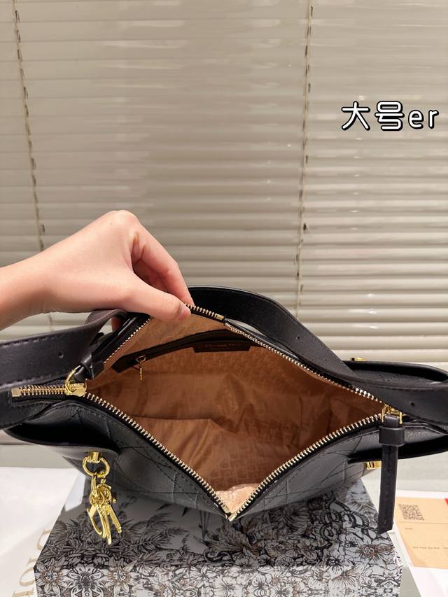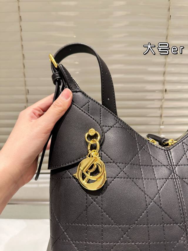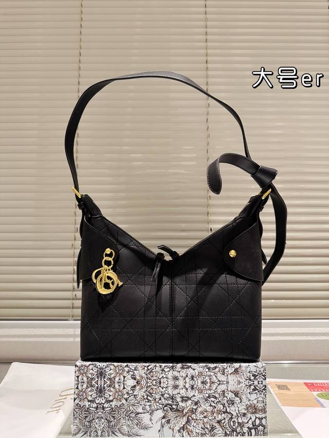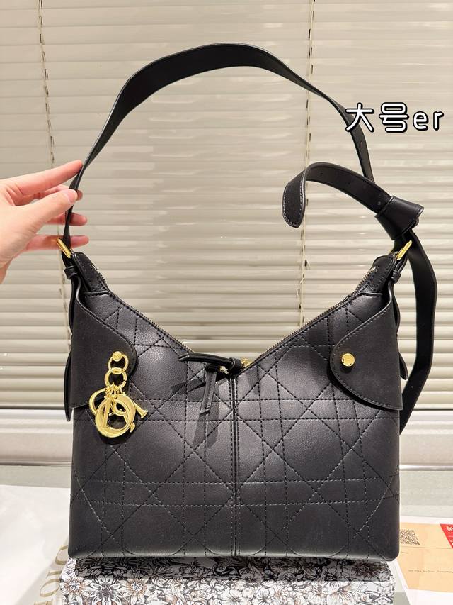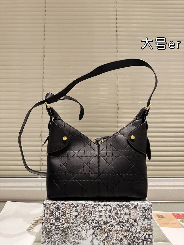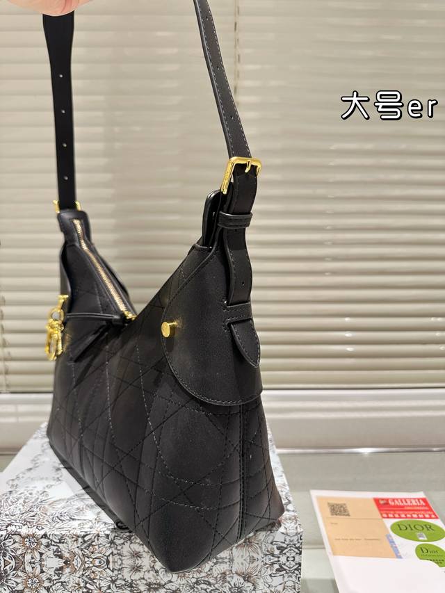 Large Box DDD Dior Voyage Shoulder Bag DDD This Dior Voyage handbag is a new addition to the 2026 Early Spring Ready-to-Wear collection, blending soft lines and elegant details to create a harmonious dumpling bag silhouette. DDD Crafted from black pleated calfskin, it features flat, oversized cannage stitching, a fresh interpretation of Dior's classic pattern. The soft silhouette is enhanced by vintage gold-finished DIOR charms and meticulously crafted leather accents, giving it a more structured look. The main compartment features a secure and practical two-way zip closure. A large size with an adjustable buckle on the top handle, it can be carried over the shoulder, making it an ideal companion for everyday styling. DDD Dimensions: 28.2 3 DDD