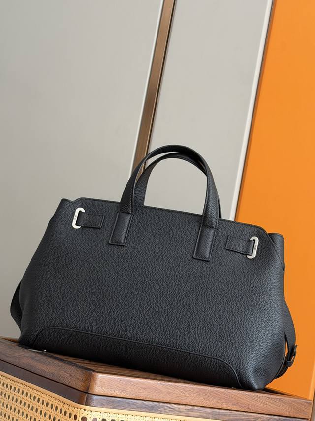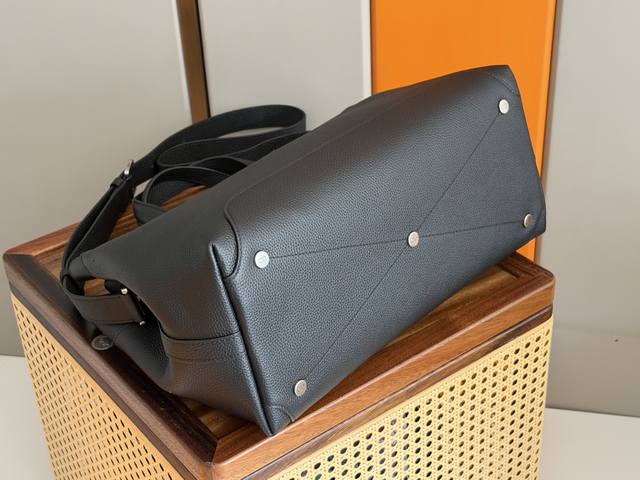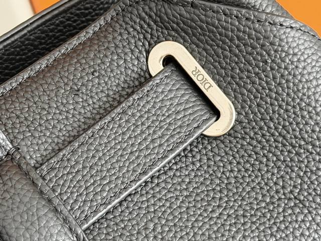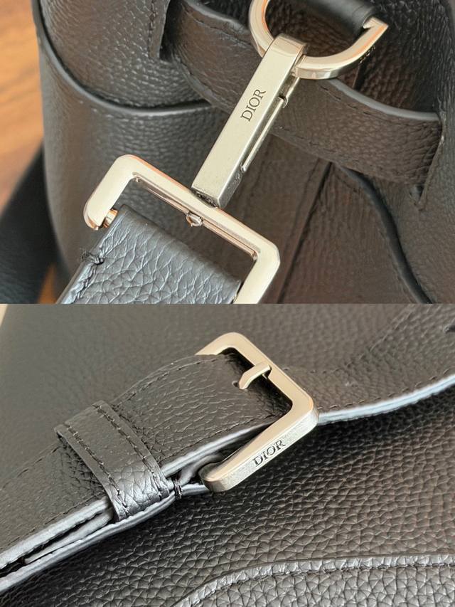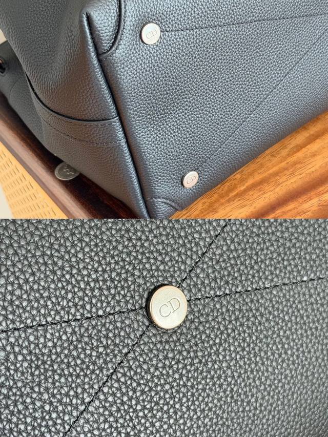 . This Dior Normandie handbag seamlessly blends practical design with Dior's haute couture spirit. Crafted from black Dior Icons calfskin, it showcases the exquisite craftsmanship of the Dior ateliers. Adorned with Dior Normandie's signature eyelets for added elegance, it features an adjustable Dior leather strap that can be folded or opened for a relaxed look. The sides reveal a distinctive structural design with Dior logo feet and a padded top handle, highlighting its refined charm. The spacious interior, lined with herringbone pattern, includes two slip pockets and one zip pocket. The medium size comes with an adjustable, detachable leather shoulder strap for comfortable hand or shoulder carrying. Body: Cowhide leather Lining: Cotton, Cowhide leather Spacious main compartment with leather strap Double interior slip pockets Interior zip pocket Adjustable, detachable leather shoulder strap Padded leather top handle 5 metallic Dior logo feet Front adorned with vintage silver-finished brass Dior logo Interior embossed Dior logo Dimensions: 38 x 25 x 17 cm Item Number: 93926 Small Black Leather
