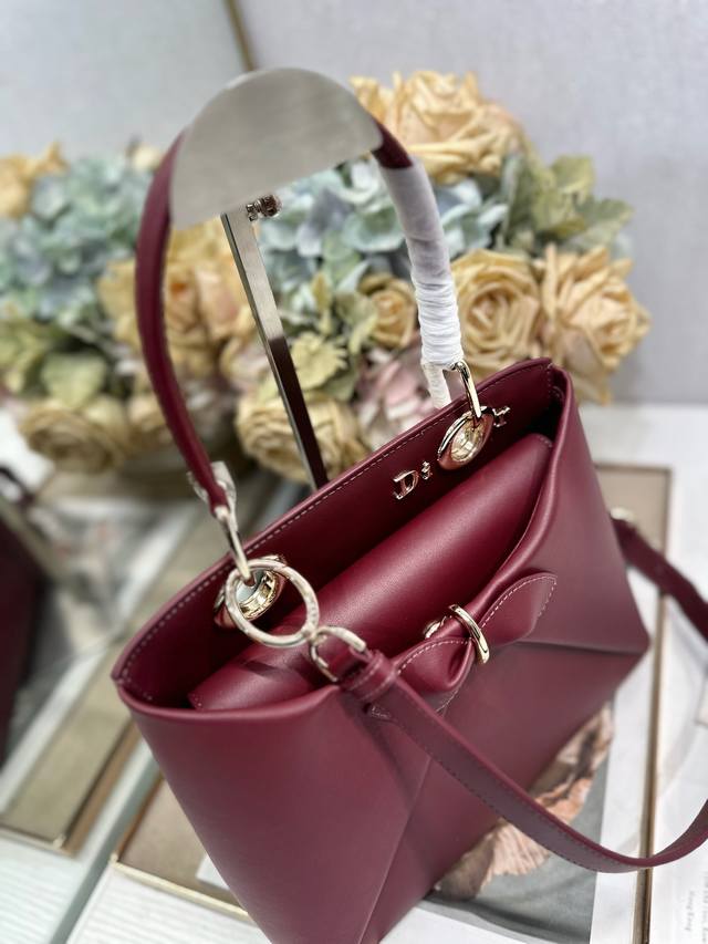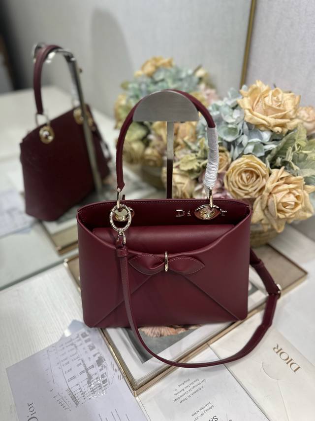 Authentic DDD Dior 2026 Spring/Summer New Arrival#Bow Handbag in Burgundy DDD A newly designed silhouette and shape, rich in color, suitable for many! It strikes the perfect balance between extravagance and elegance! Its design is inspired by Monsieur Dior's Cigale gown~ The three-dimensional trapezoidal body + single handle exudes an elegant and sophisticated style. The bag's appearance is relatively understated, with almost no obvious large logos. Upon closer inspection, you'll discover that Anderson has integrated the Dior logo with the round holes on the bag's handle. DDD The bag is both recognizable and not ostentatious, radiating an understated sense of luxury! It's worth mentioning that this bag also comes with a long leather shoulder strap. Especially when traveling, you can switch to the long shoulder strap, freeing your hands and making you look relaxed and casual~ DDD Model: 0737 DDD Dimensions: 28*10*22 Length*Width*Height DDD