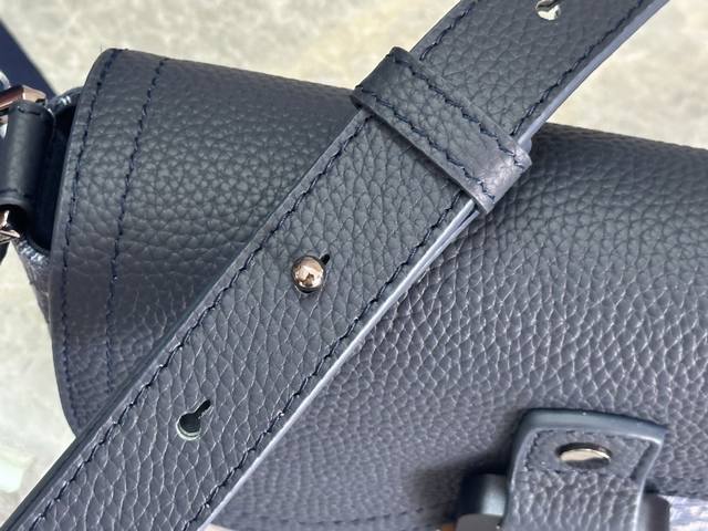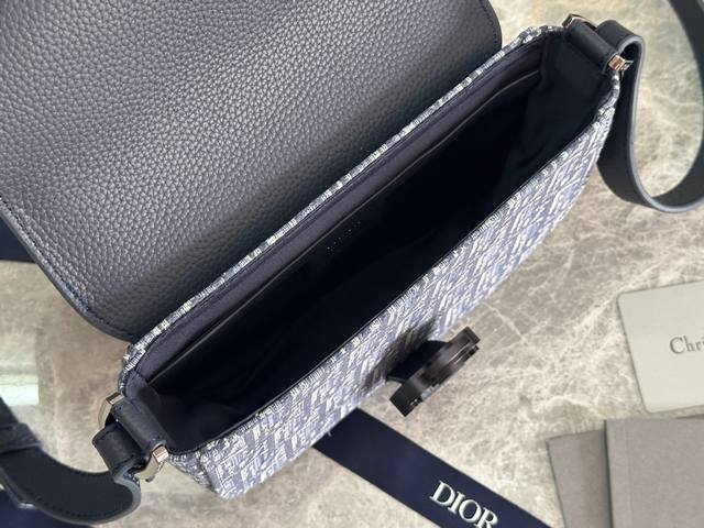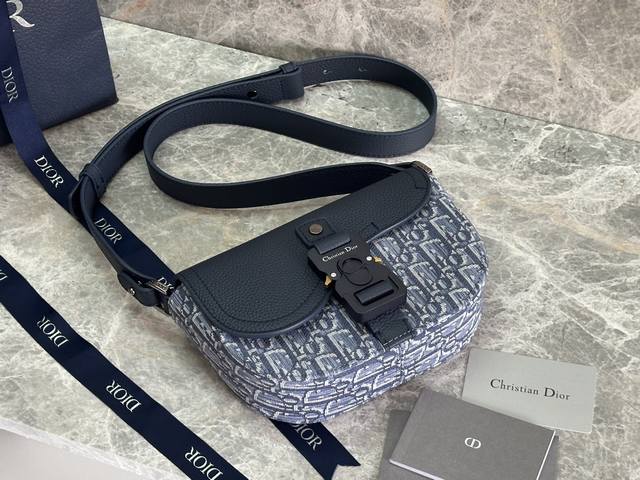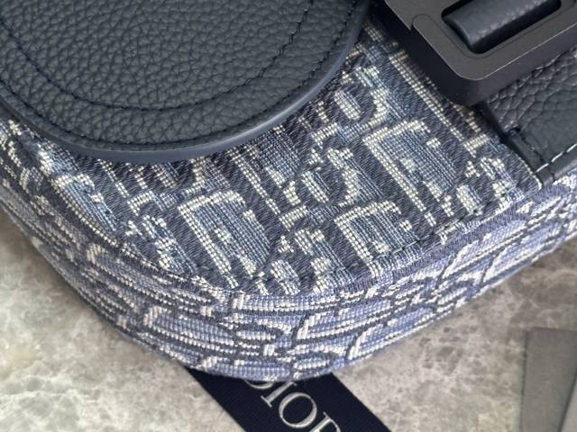 This Saddle messenger bag features a stylish design with a flap, showcasing refined elegance and elevating the Saddle collection. Crafted from materials such as blue Oblique print fabric, it features a saddle flap in tonal grained cowhide leather, embellished with an aluminum buckle bearing the Christian Dior logo. This miniature style features an adjustable and detachable leather shoulder strap for hand-carrying, shoulder-carrying, or cross-body wear.