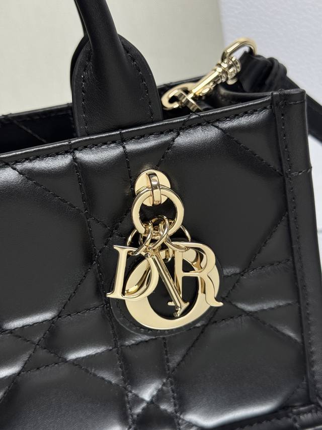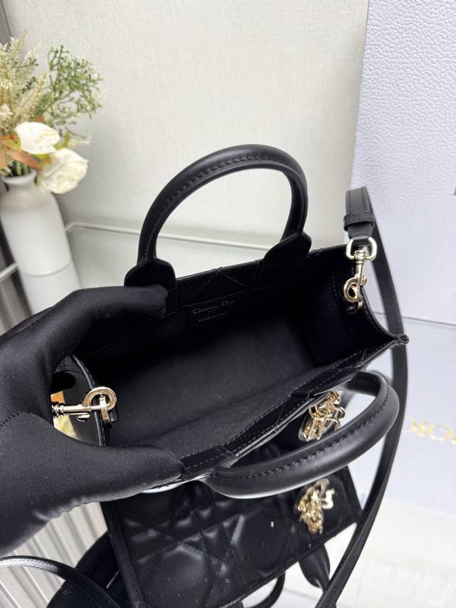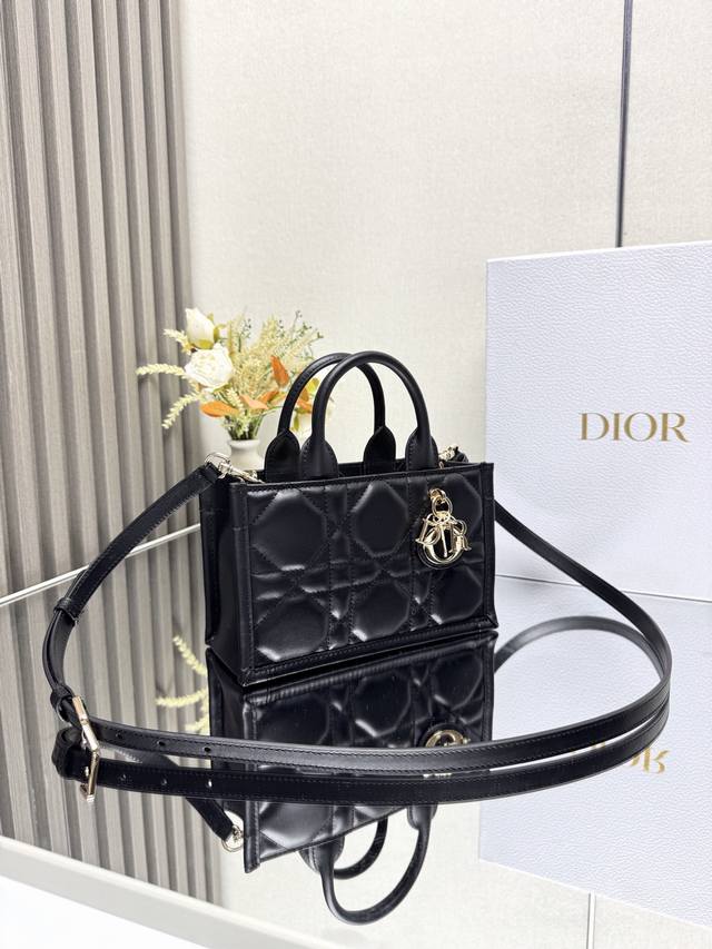Authentic, High-Quality Dior Book Tote Handbag, Model: M1326. Presented by Maria Grazia Chiuri, the Book Tote handbag perfectly embodies Dior's classic interpretation of elegance. Crafted from calfskin leather, it features an oversized cannage pattern and a light gold-finished DIOR charm on the handle. The interior, crafted from cashmere and leather, includes a zip pocket and slip pocket for neatly storing everyday essentials. Its lightweight and practical design, paired with an adjustable and detachable shoulder strap, showcases Dior's exquisite craftsmanship, allowing it to be carried by hand or over the shoulder. Mini size: 21.5 x 7.5 x 13 cm.