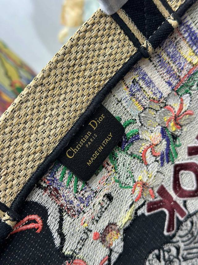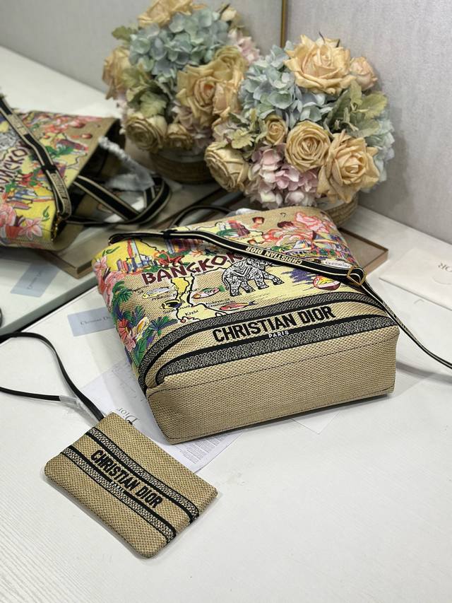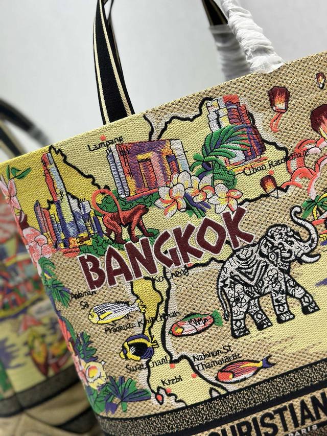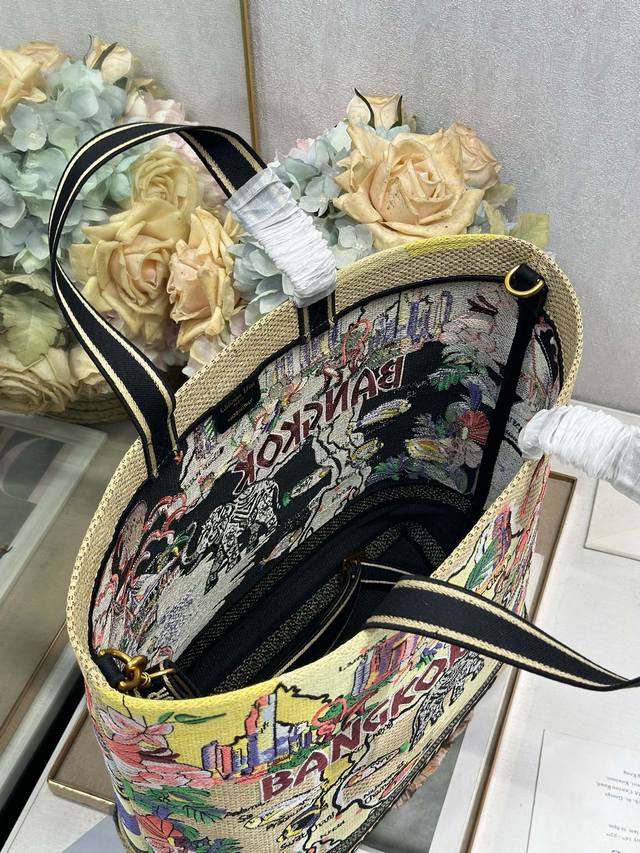 Authentic, High-Quality Dior City Postcard Resort Style Handbag (Bangkok Limited Edition). This stylish and practical city postcard handbag is uniquely designed. It features meticulous embroidery in various colors, combining local Bangkok culture with Dior's high-end embroidery. The spacious interior compartments can hold various daily essentials and include a small tote bag. The large size includes an embroidered top handle and a detachable embroidered shoulder strap, allowing for hand-carrying, shoulder-carrying, or crossbody wear. Model: 1288. Dimensions: Length 34 cm, Width 13 cm, Height 35 cm.