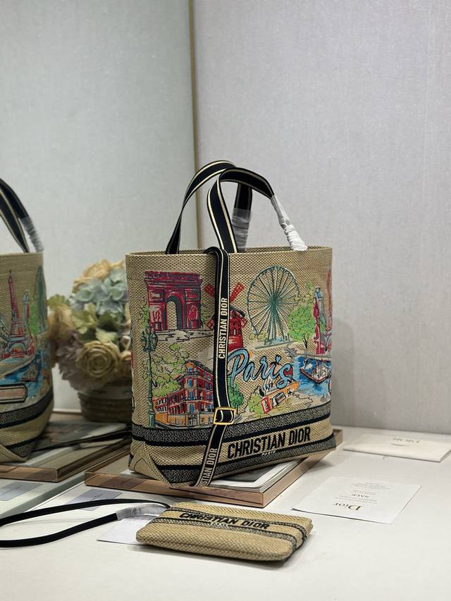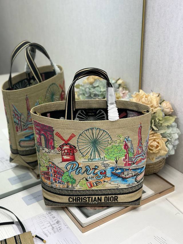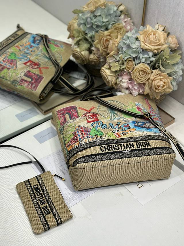 Authentic, High-Quality Dior City Postcard Resort Style Handbag, Paris Limited Edition. This city postcard handbag is stylish, practical, and unique. It's meticulously crafted with embroidery in various colors, combining local Parisian culture with Dior's high-end embroidery. The spacious interior compartments can hold various daily essentials and come with a small tote bag. The large size features an embroidered top handle and a detachable embroidered shoulder strap, allowing for hand-carrying, shoulder-carrying, or crossbody wear. Model: 1288. Dimensions: Length 34 cm, Width 13 cm, Height 35 cm.