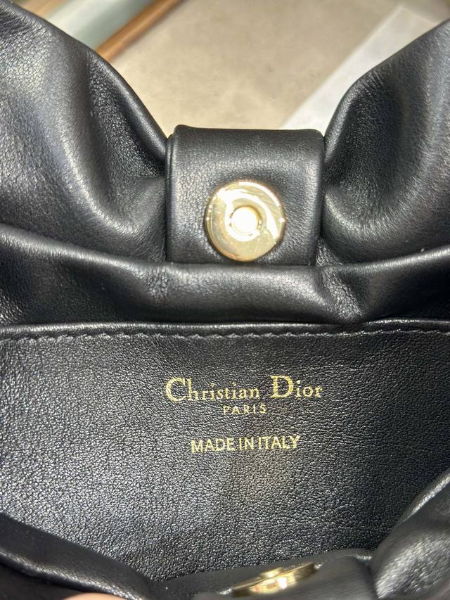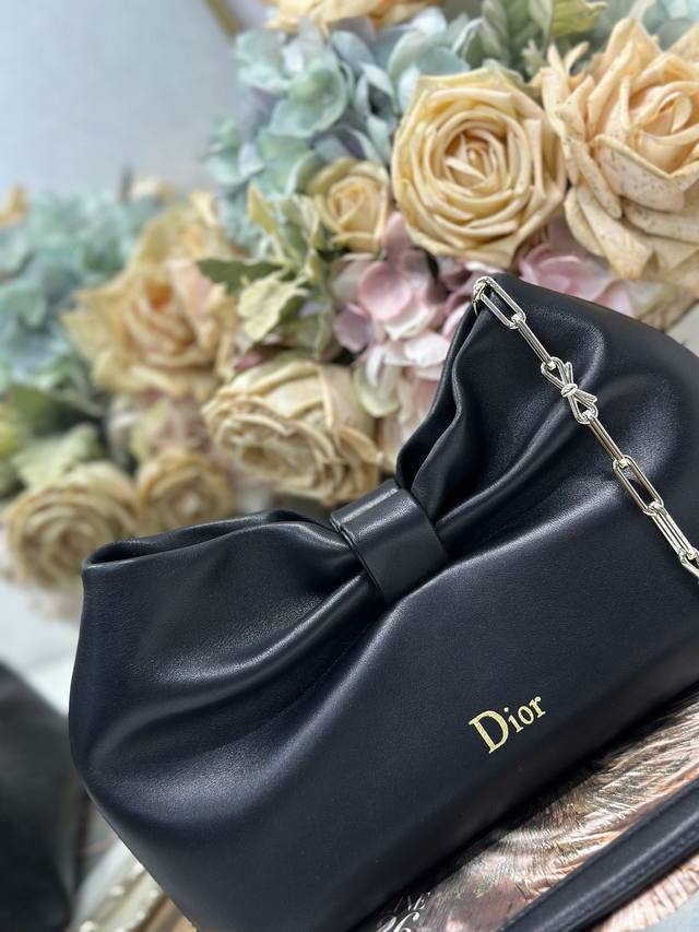 Authentic, High-Quality Dior-Lambskin 2026 Spring/Summer New Handbag, Black with Light Gold Chain. A brand new bag shape, made of calfskin leather, elegant and sophisticated, practical in style, capable of holding various everyday items, making it an ideal companion for both day and evening wear. The detachable chain is adorned with a butterfly knot for added refinement. It can be carried by hand or worn crossbody. Model: 0714. Dimensions: 27