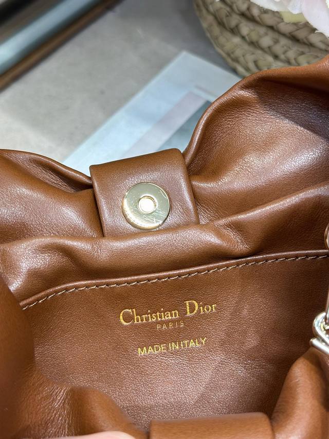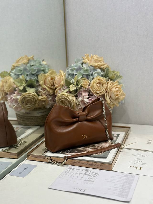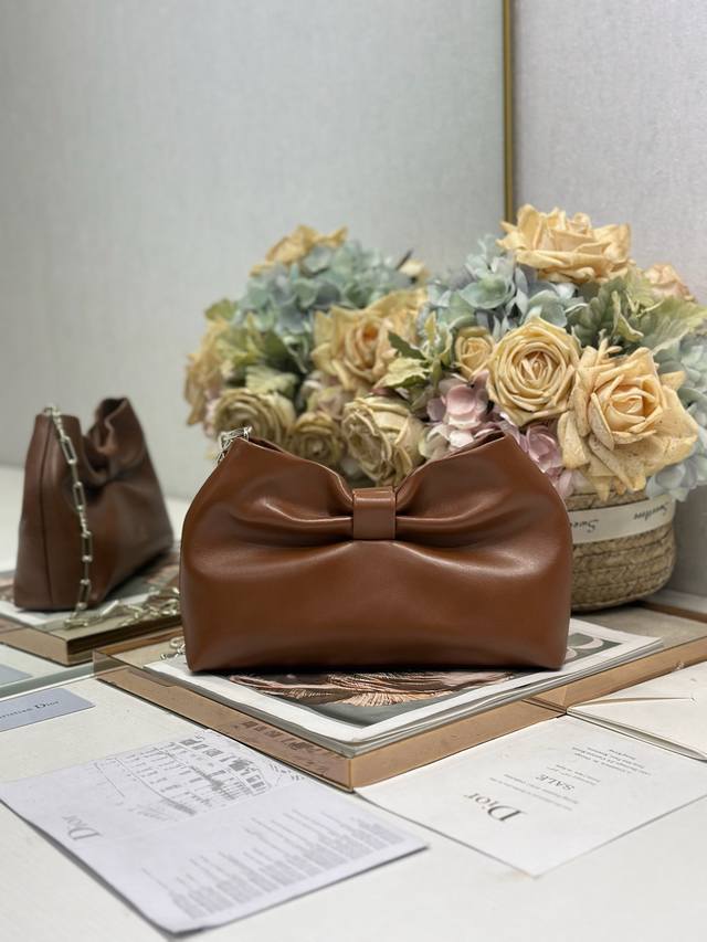 Authentic, High-Quality Dior-Lambskin 2026 Spring/Summer New Handbag, Brown with Light Gold Chain. A brand new bag shape, made of calfskin leather, elegant and sophisticated, practical in style, capable of holding various everyday items, making it an ideal companion for both day and evening wear. The detachable chain is adorned with a butterfly knot for added refinement. It can be carried by hand or worn crossbody. Model: 0714. Dimensions: 27