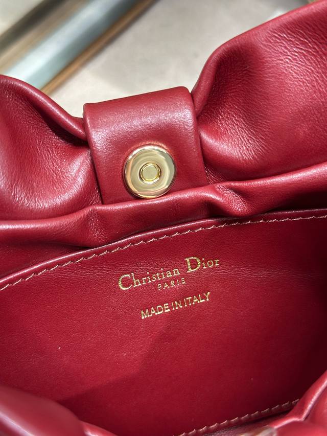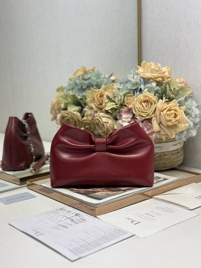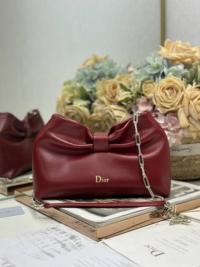 Authentic, High-Quality Dior-Lambskin 2026 Spring/Summer New Handbag, Burgundy with Light Gold Chain. A brand new bag shape, crafted from calfskin leather, elegant and sophisticated, practical in style, capable of holding various everyday essentials, making it an ideal companion for both day and evening wear. The detachable chain is adorned with a butterfly knot for added refinement. Can be carried by hand or worn crossbody. Model: 0714. Dimensions: 27
