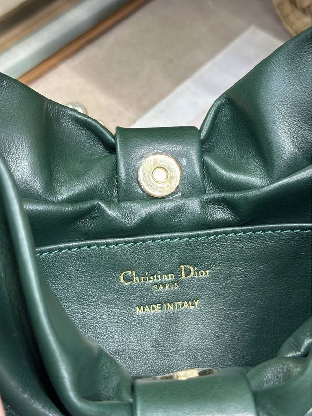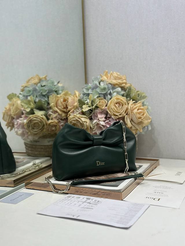 Authentic, High-Quality Dior-Lambskin 2026 Spring/Summer New Handbag, Green with Light Gold Chain. A brand new bag shape, made of calfskin leather, elegant and sophisticated, practical in style, capable of holding various everyday items, ideal for both day and evening wear. The detachable chain is adorned with a butterfly knot for added refinement. Can be carried by hand or worn crossbody. Model: 0714. Dimensions: 27