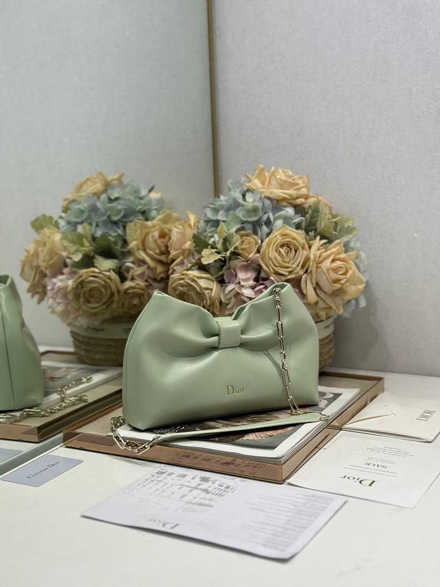 Authentic, High-Quality Dior-Lambskin 2026 Spring/Summer New Handbag in Avocado Green with Light Gold Chain. This Lambskin chain bag features a brand new shape, the texture of calfskin leather, and an elegant and sophisticated design. Practical in style, it can hold various everyday items and is an ideal companion for both day and evening wear. The detachable chain is adorned with a butterfly knot for added refinement. It can be carried by hand or worn crossbody. Model: 0714. Dimensions: 27