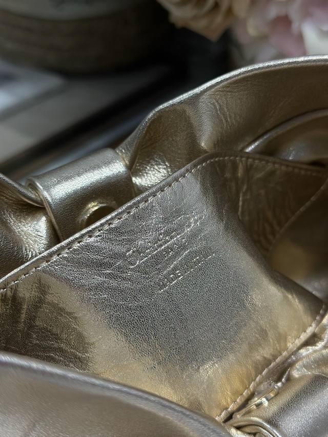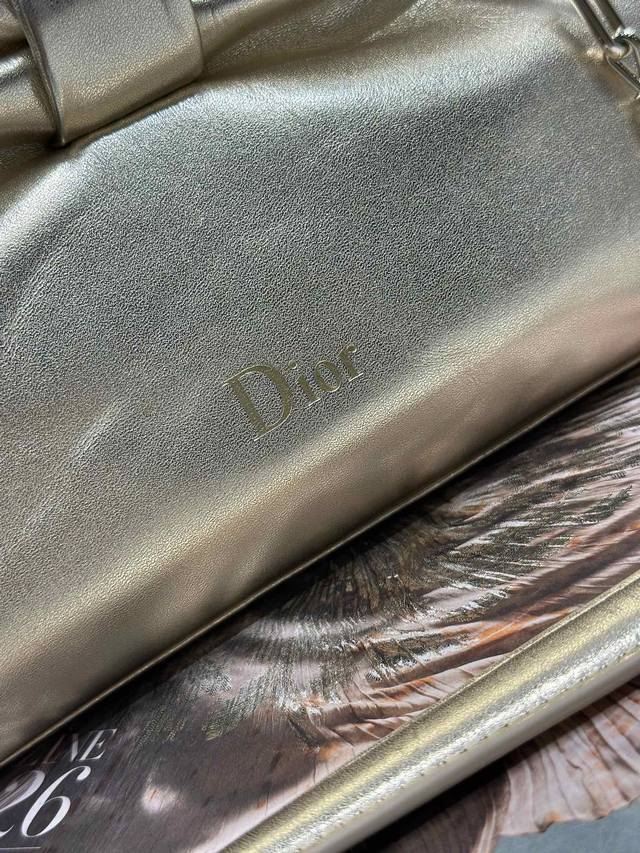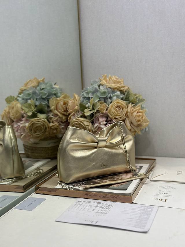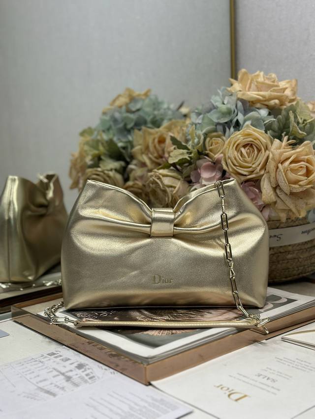 Authentic, High-Quality Dior-Lambskin 2026 Spring/Summer New Handbag with Gold and Light Gold Chain. A brand new bag shape, made of calfskin leather, elegant and sophisticated, practical in style, capable of holding various everyday items, making it an ideal companion for both day and evening wear. The detachable chain is adorned with a butterfly knot for added refinement. It can be carried by hand or worn crossbody. Model: 0714. Dimensions: 27