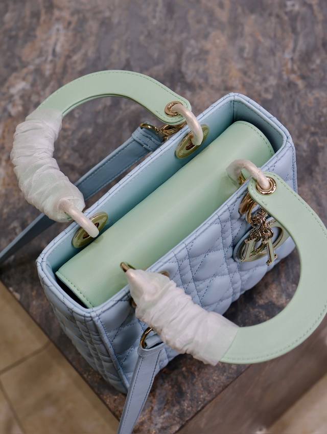 Authentic, High-Quality Lady Dio.R Light Blue and Light Green Four-Compartment Lambskin Adjustable Shoulder Strap. This handbag embodies Dio.R's profound insight into elegance and beauty. Crafted from lambskin leather with quilted details featuring the signature cannage stitching, its elegant and classic design is timeless. Adorned with a light gold Dior hardware pendant, it features a velvet lining, an adjustable shoulder strap, and an interior zip pocket. It can be carried by hand, over the shoulder, or crossbody. Dimensions: 20 x 16.5 x 8 cm. Model Number: 0531.