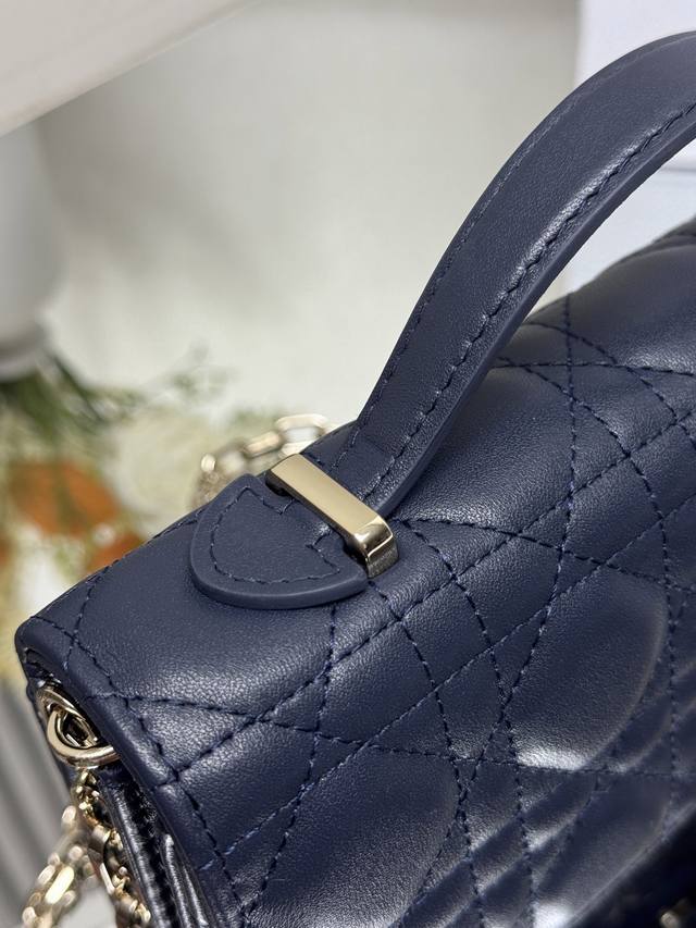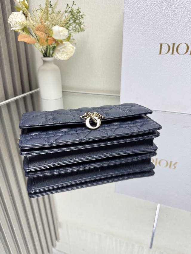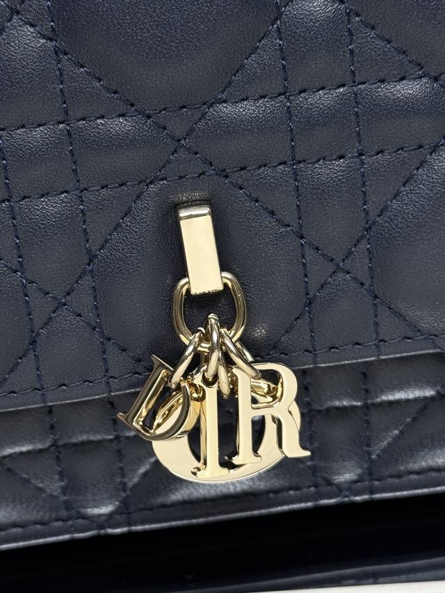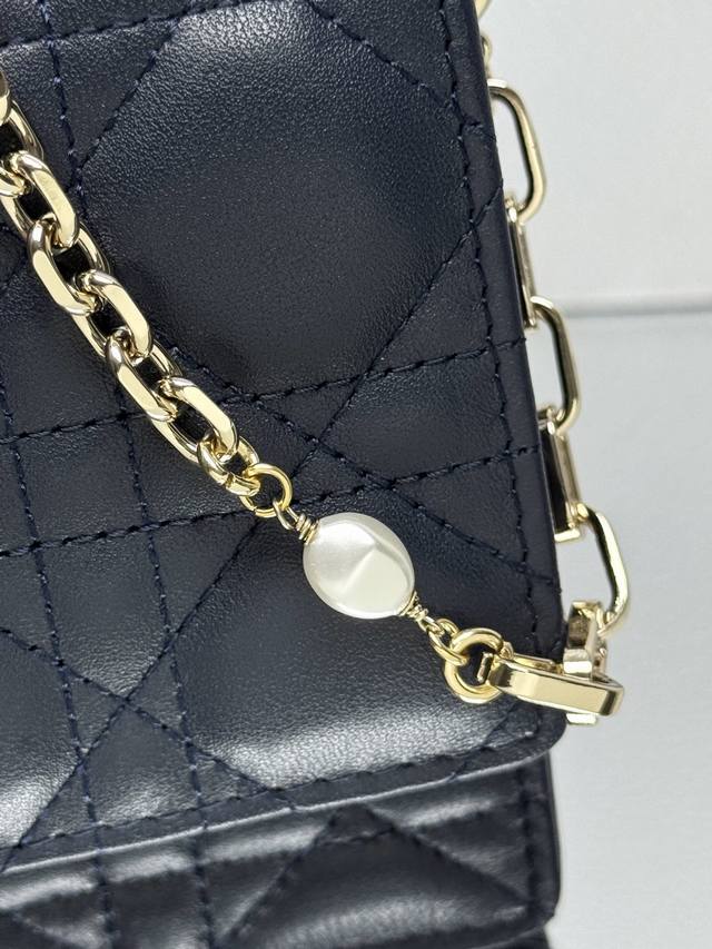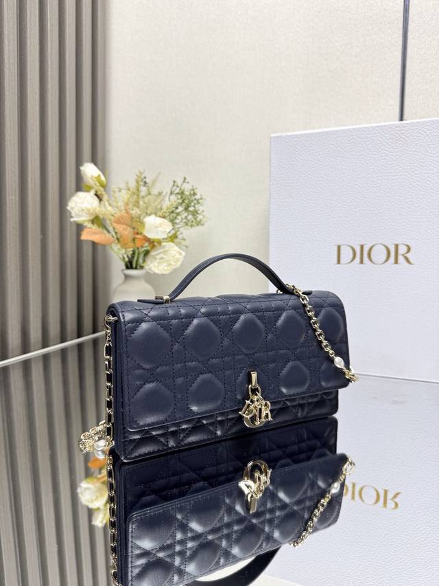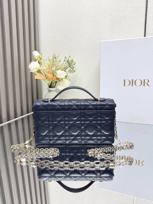 Authentic, High-Quality Lady Dior Pearl Clutch in Dark Blue Lambskin. This new season clutch features a top handle, combining elegance and practicality to enrich the Lady Dior collection. Crafted from black lambskin with a cannage pattern, the flap design is adorned with a DIOR charm for added sophistication. Practical in design, it offers multiple compartments and card slots for various everyday essentials, making it an ideal companion for both day and evening wear. The top handle features a detachable chain embellished with beads for added refinement, and can be carried by hand or crossbody. Model: 0809 Dimensions: 21 x 11.5 x 4.5cm Front DIOR charm Flap closure 2 internal compartments Back slip pocket 3 card slots Top leather handle Detachable chain embellished with beads