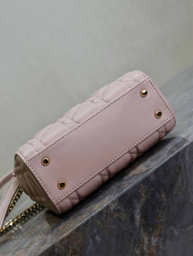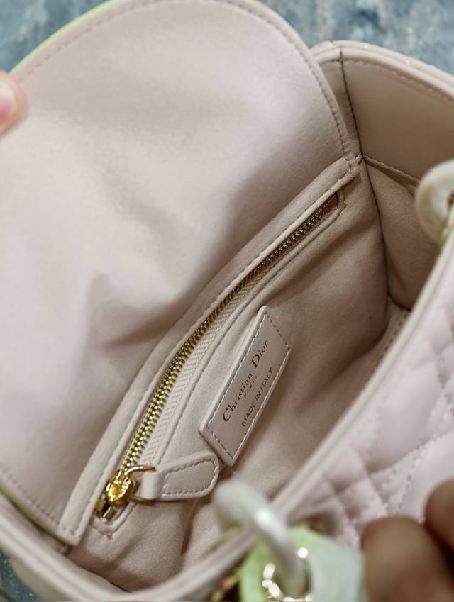 Authentic, High-Quality Lady Dio.R Pink and Light Yellow Three-Compartment Lambskin Shoulder Strap This handbag embodies Dio.R's profound insight into elegance and beauty. Crafted from lambskin leather with quilted details featuring the signature cannage stitch, its elegant and classic design is timeless. Adorned with a light gold Dior hardware pendant, it features a velvet lining, a chain shoulder strap, an adjustable thin shoulder strap, and an interior zip pocket. It can be carried by hand, over the shoulder, or crossbody. Dimensions: 17 x 7.5 x 14 cm. Model Number: 0505.