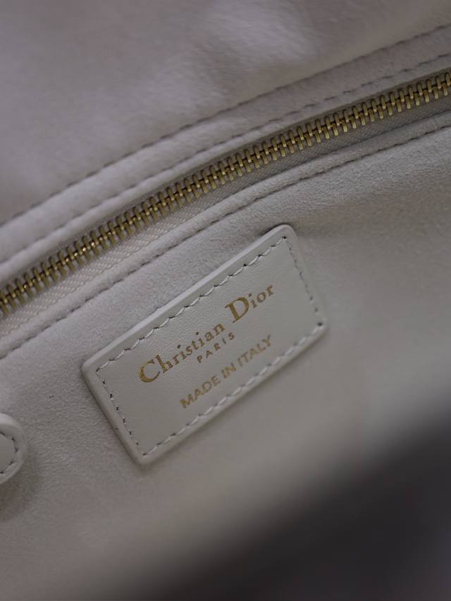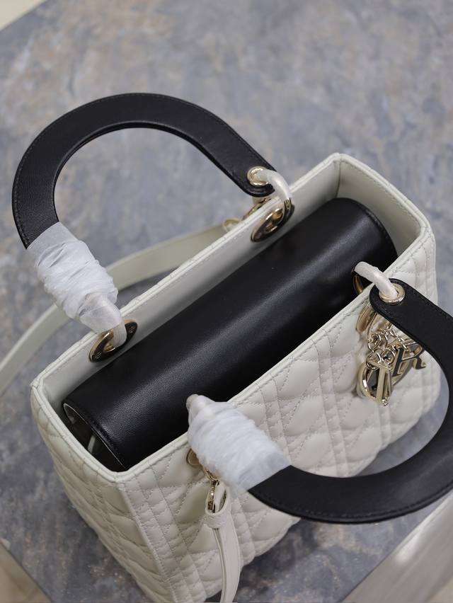 Authentic, High-Quality Lady Dio.R White and Black Trim, Five-Compartment Lambskin Adjustable Shoulder Strap. This handbag embodies Dio.R's profound insight into elegance and beauty. Crafted from lambskin leather with signature cannage stitching details, its elegant and classic design is timeless. Adorned with a light gold Dior hardware pendant, it features a velvet lining, an adjustable shoulder strap, and an interior zip pocket. Can be carried by hand, over the shoulder, or crossbody. Dimensions: 24