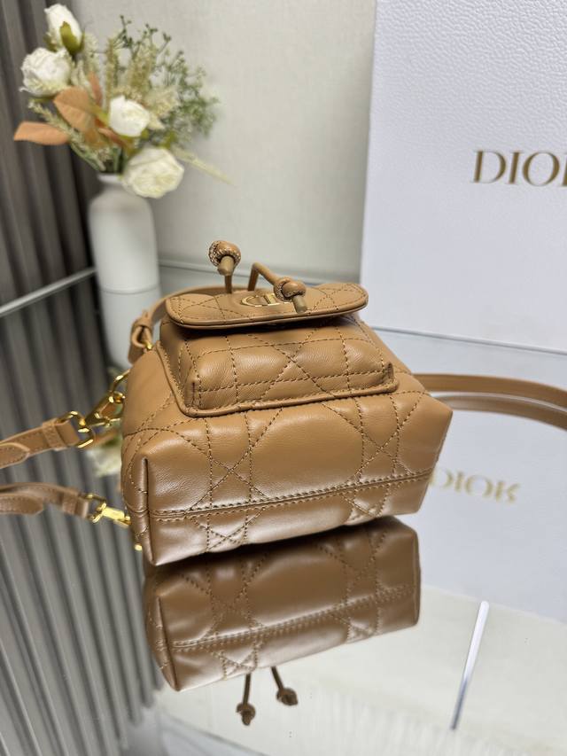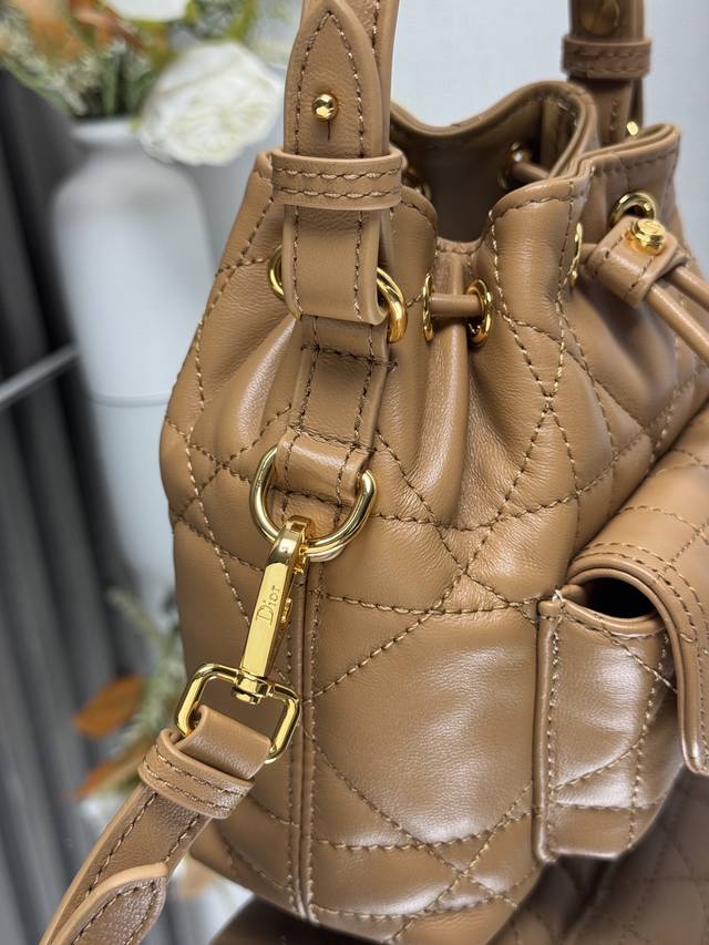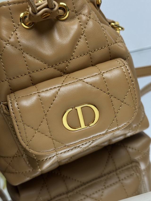Authentic, High-Quality DDD This mini Dior Caro bucket bag is a new addition to the Fall 2025 ready-to-wear collection, exuding fashionable elegance. Crafted from black lambskin leather with oversized cannage stitching, it features a drawstring compartment. The front flap pocket, adorned with a vintage gold-finished Cd logo, can hold various small everyday items. Stylish and versatile, it comes with a detachable top handle and an adjustable, detachable shoulder strap, allowing for hand-carrying, shoulder-carrying, or crossbody wear. DDD Front drawstring closure with Cd logo DDD Front magnetic flap pocket Interior slip pocket DDD Detachable leather top handle DDD Adjustable, detachable leather shoulder strap Includes dust bag DDD Dimensions: 14*15*7Cm DDD Made in Italy DDD Model: 5250 DDD Mini tan DDD