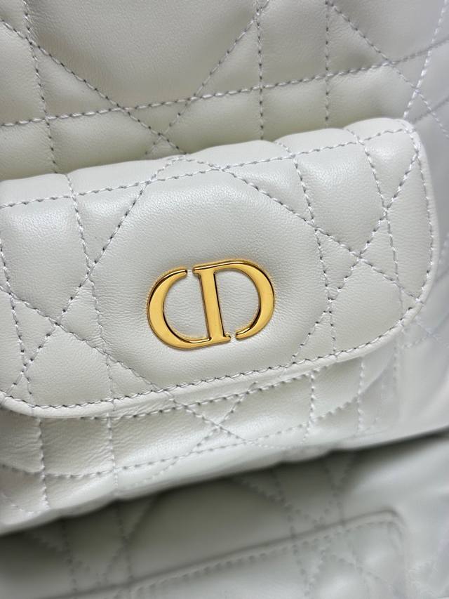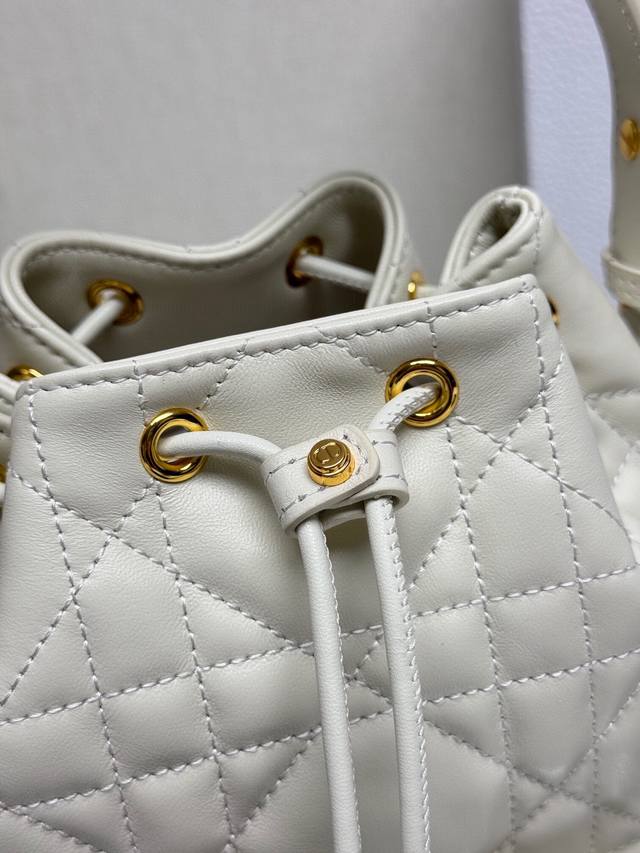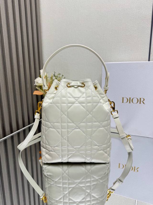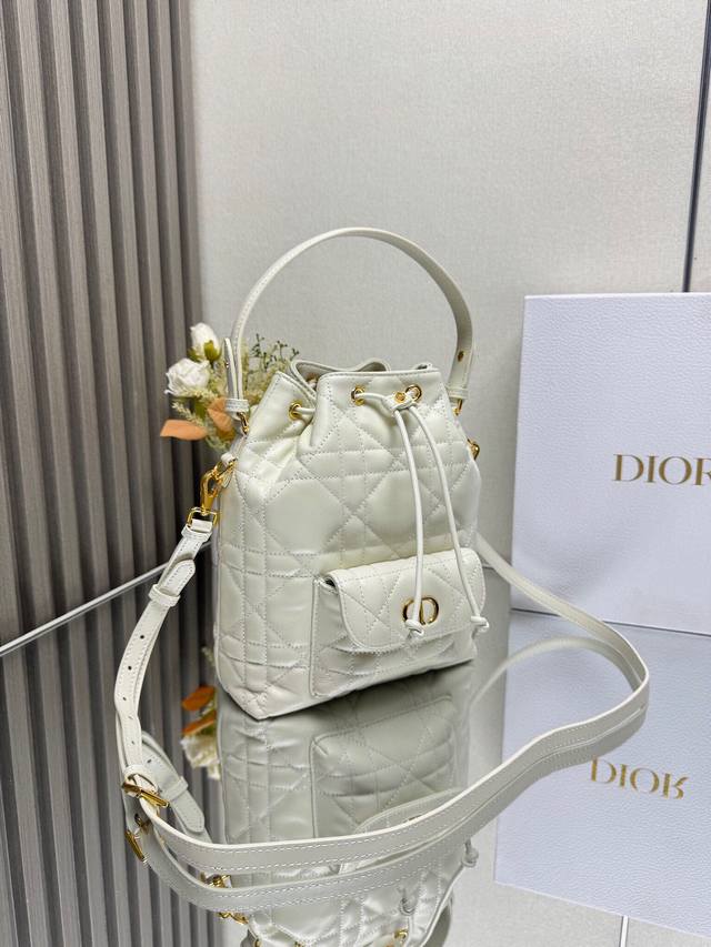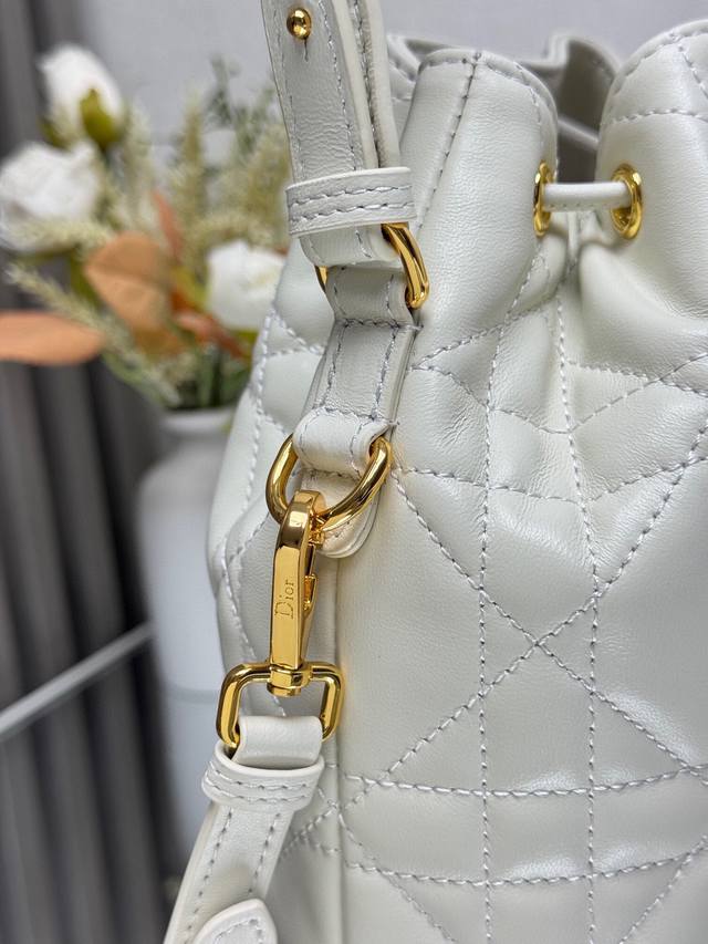 Authentic, High-Quality Version DDD This Dior Caro bucket bag is a new addition to the Fall 2025 ready-to-wear collection, showcasing a stylish and elegant look. Crafted from black lambskin leather and other materials, it features oversized cannage stitching and a spacious drawstring compartment. The front flap pocket is adorned with a gold-plated metal Cd logo and can hold various small everyday items. The small size comes with a detachable top handle and an adjustable, detachable shoulder strap, allowing for easy hand-carrying, shoulder-carrying, or crossbody wear. DDD Body: Lambskin leather DDD Cowhide leather Lining: Cowhide leather DDD Front with Cd logo drawstring closure DDD Front slip pocket with magnetic flap interior slip pocket DDD Detachable leather top handle DDD Adjustable, detachable leather shoulder strap Includes dust bag DDD Model: M3372 DDD Off-white DDD Dimensions: 20cm*24cm*9cm DDD