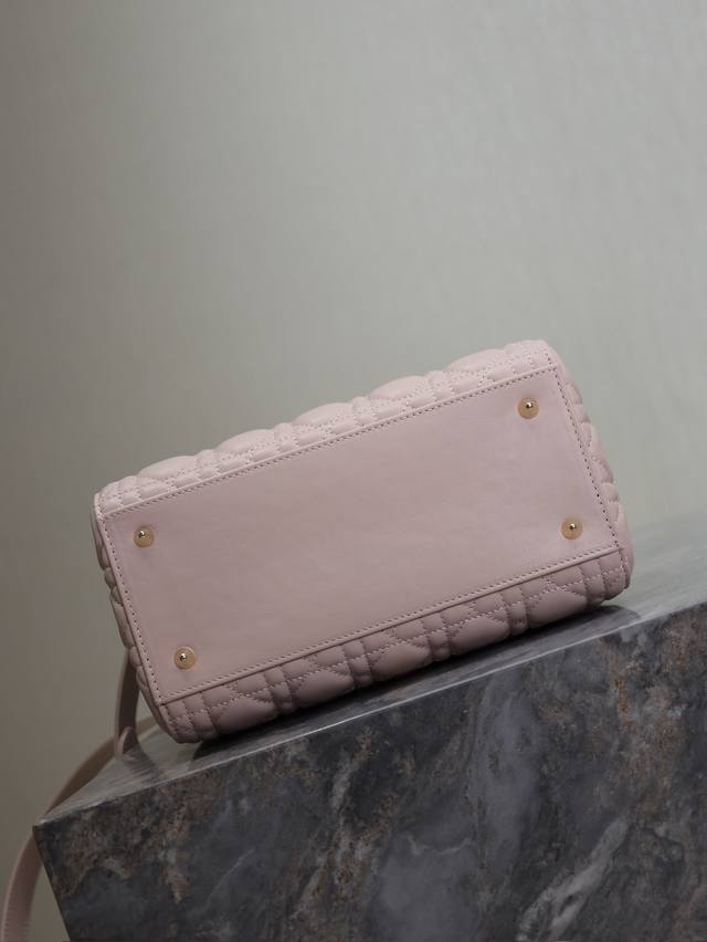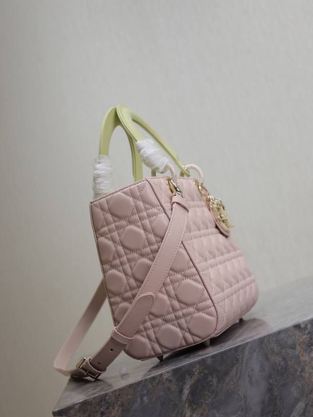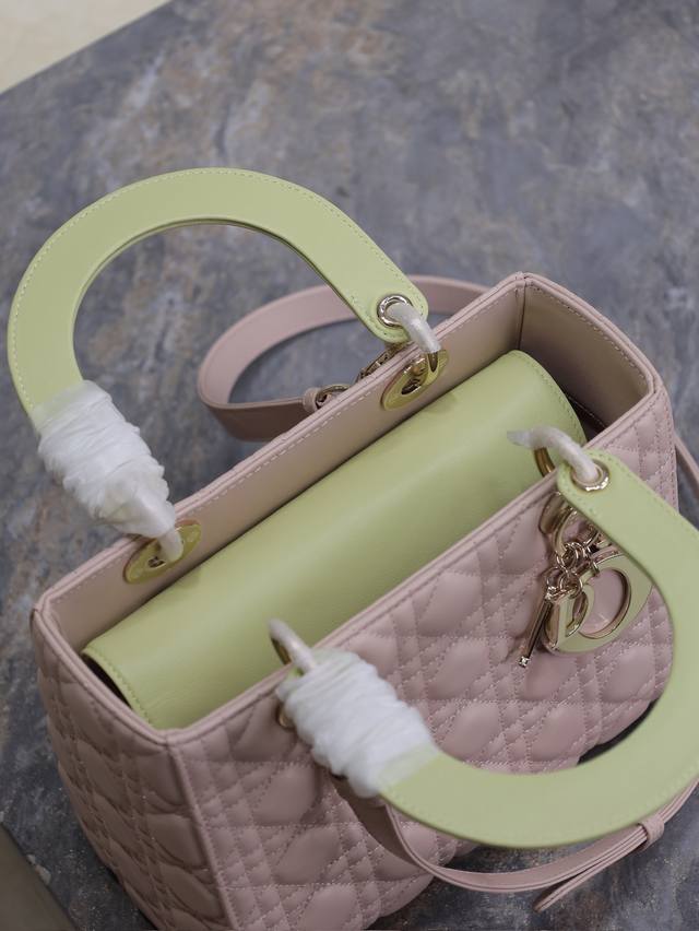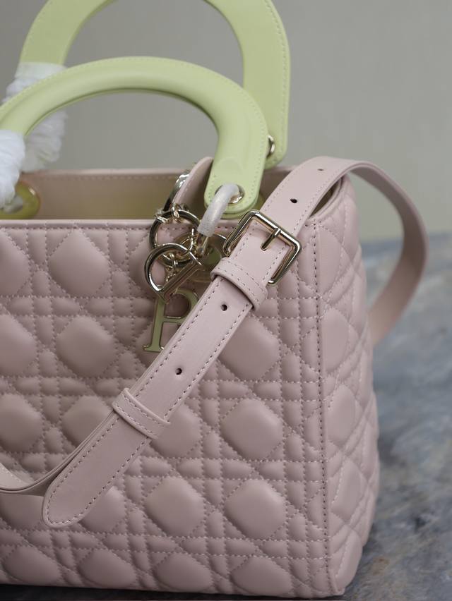 Authentic Lady Dio.R Pink and Light Yellow Five-Compartment Lambskin Adjustable Shoulder Strap. This handbag embodies Dio.R's profound insight into elegance and beauty. Crafted from lambskin leather with quilted details in the signature cannage stitch, its elegant and classic design is timeless. Adorned with a light gold Dior hardware pendant, it features a velvet lining, an adjustable shoulder strap, and an interior zip pocket. It can be carried by hand, over the shoulder, or crossbody. Dimensions: 24
